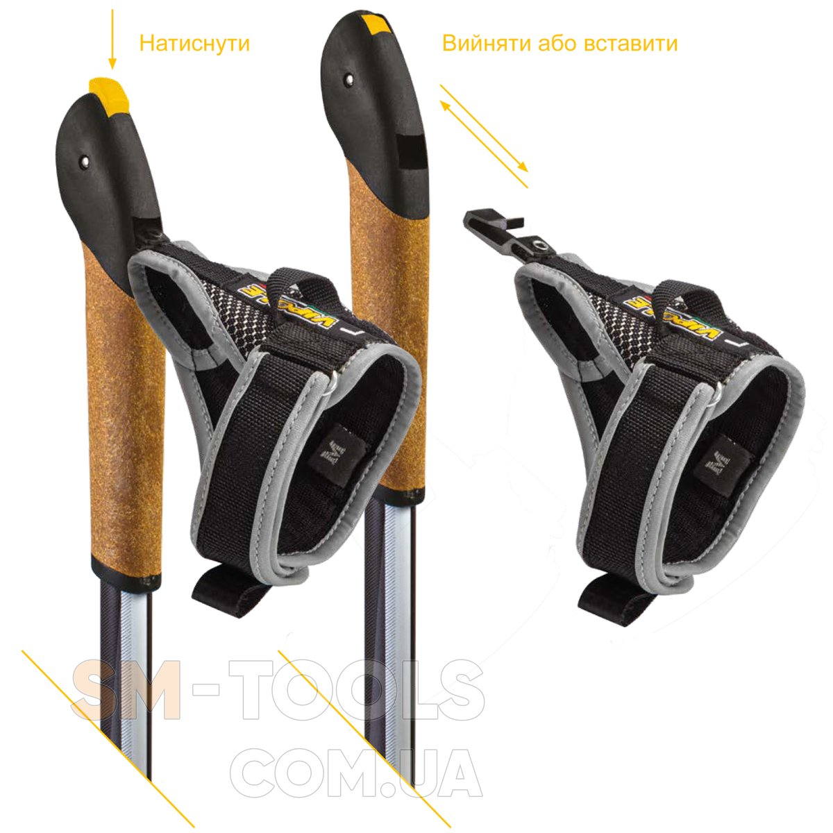 Система быстрого отстегивания темляка Top-Click представляет собой специальной формы фастекс с верхней кнопкой, которая позволяет моментально освободить руку с темляком от палки. Достаточно просто нажать на кнопку большим пальцем. Так же просто темляк пристегивается обратно. Используя систему Top-Click, можно моментально освободить руку, не снимая темляка, что очень удобно, когда необходимо срочно ответить по телефону.