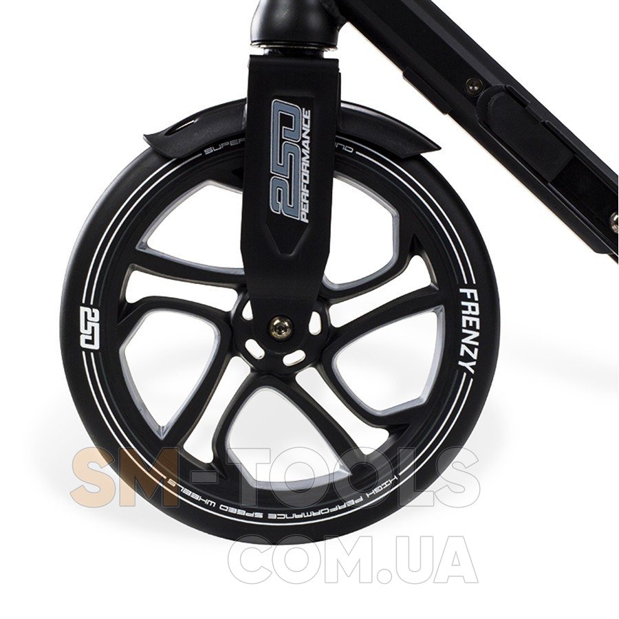 Frenzy 250 mm Recreational – прогулочный самокат на больших полиуретановых колёсах. Переднее 250 мм и заднее 215 мм колесо обеспечивают приятный и долгий накат даже по неровной поверхности. Новый усовершенствованный складной механизм для компактного хранения и транспортировки позволяет катить самокат за собой. Идеальное решение для путешествий и повседневных поездок на учебу и работу.