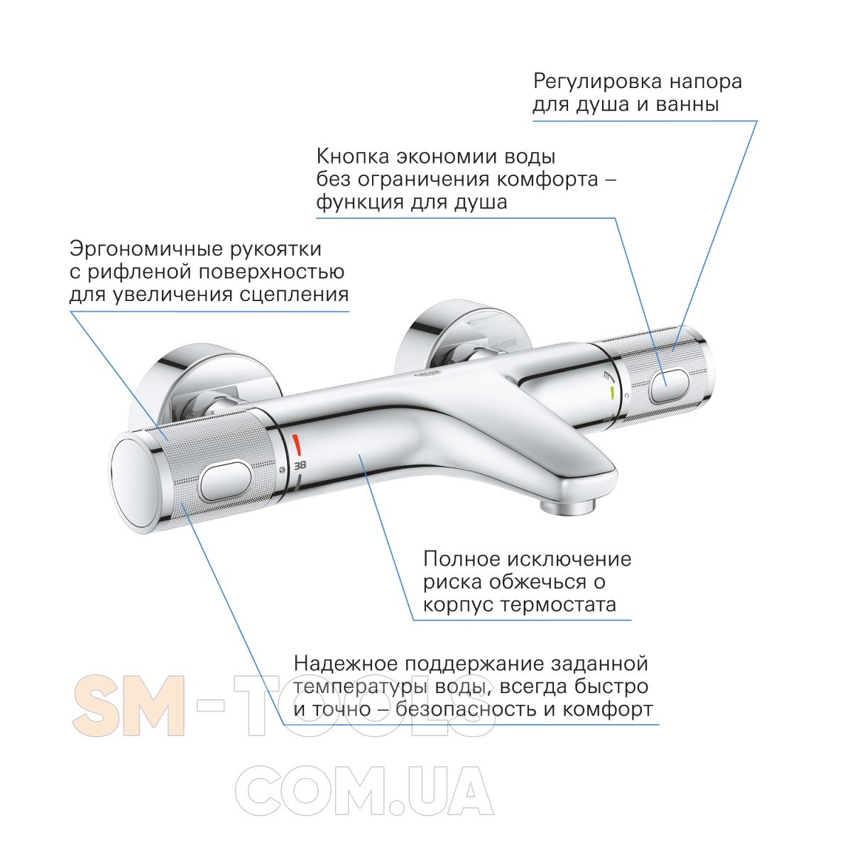 Этот шикарный термостат изготовлен в хромированном покрытии по технологии GROHE StarLight, для отличного внешнего вида на долгие годы.