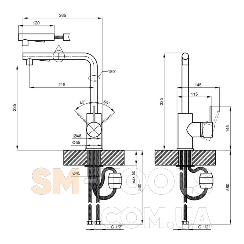 Высота излива, мм 285