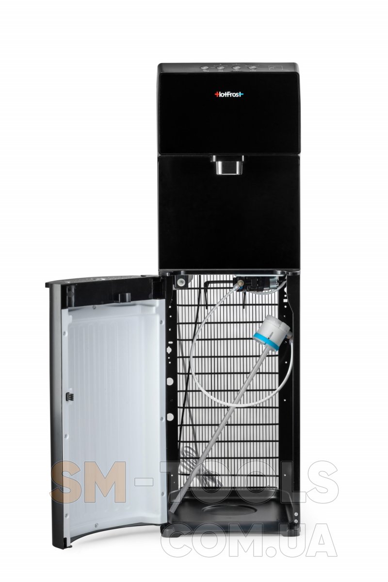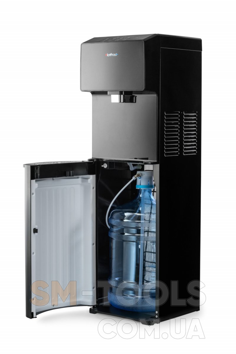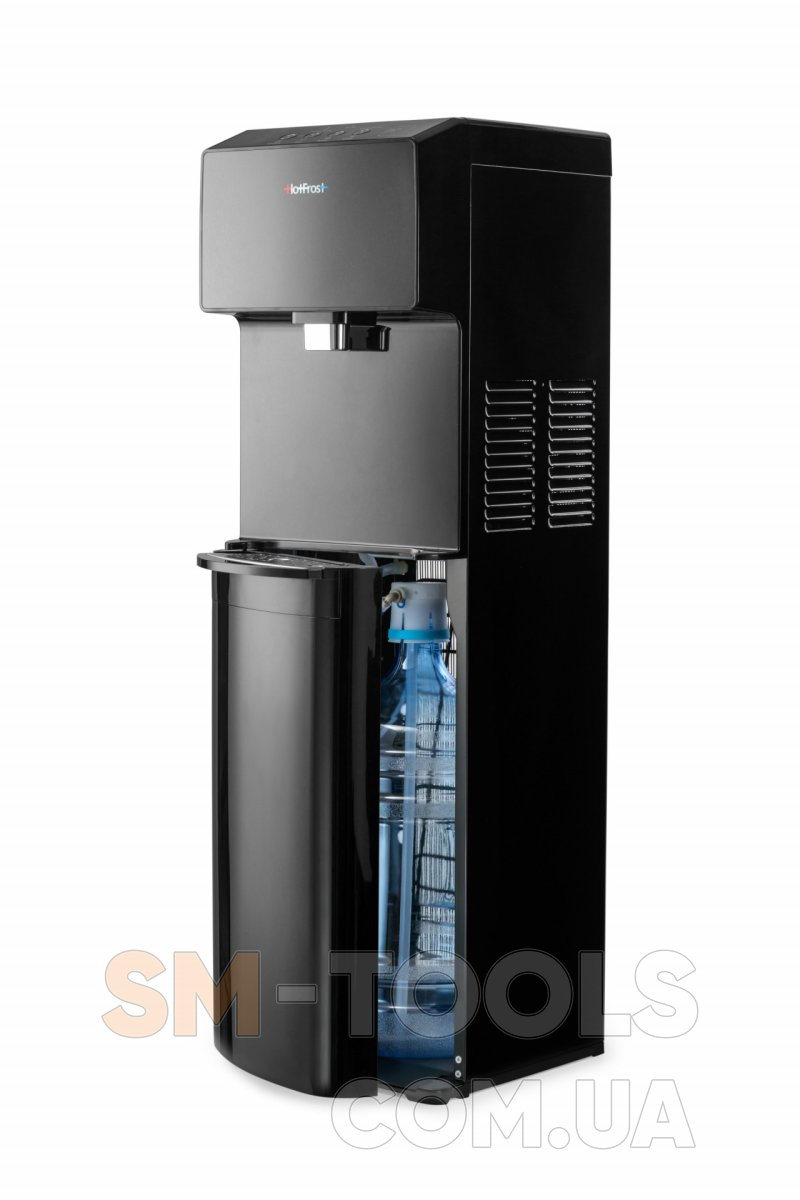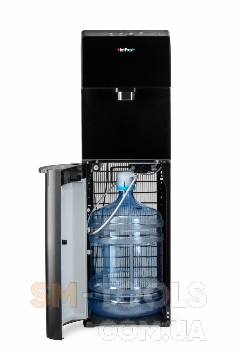 Т.к. в кулере используется нижняя загрузка бутыли (в шкафчик для бутыли), то для визуального контроля уровня воды, на панели управления имеется индикатор низкого уровня воды в бутыли, извещающий о необходимости произвести замену бутыли.