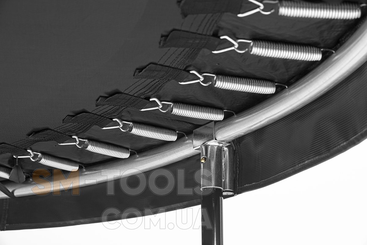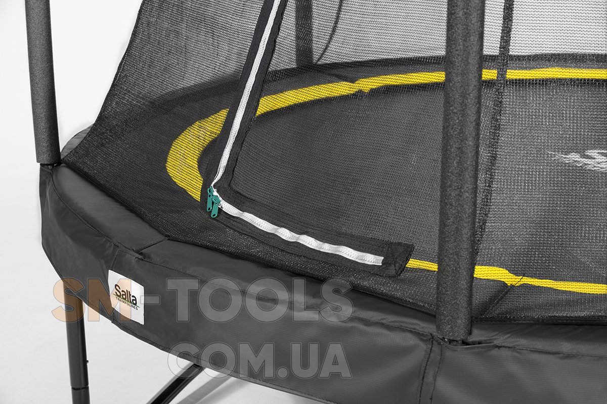 Стальной каркас крепкого батута Salta Comfort Edition выполнен из оцинкованной стали с черным глянцевым покрытием. Конструкция стального верхнего кольца удерживает защитную сетку в натянутом положении, что позволяет мягкой сетке с мелкими ячейками надежно защищать детей и взрослых от падения. Кроме того, батут оснащен специальным защитным поролоновым матом толщиной 20 мм и шириной 29 см, что покрывает оцинкованные конические пружины батута и защищает от попадания между ними ног и рук во время прыжков. Двухсторонняя молния обеспечивает легкий доступ внутрь батута и позволяет легко закрывать Salta Comfort Edition с внутренней стороны.