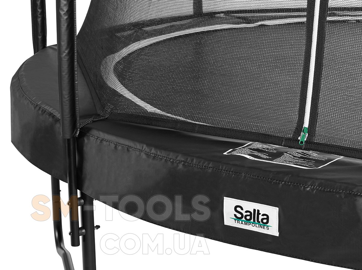 Salta Premium Black Edition оснащений міцною і стійкою оцинкованою сталевою рамою з чорним матовим покриттям яка надійно захистить від подряпин і корозії. Захисний мат широкий і товстий і має довгу "спідницю". Крім того, захисний мат виготовлений зі стійкого до вологи і ультрафіолету матеріалу. Захисна сітка батута виготовлена з високоякісного матеріалу з дрібними осередками і має додатковий м'який захист навколо стовпчиків кріплення, забезпечуючи ще більший захист і безпеку при використанні. Конструкція верхньої рейки виконана зі склопластику і забезпечує відмінний натяг захисної сітки. Подвійні конічні пружини забезпечують хороше і потужне підстрибування і м'яке приземлення.