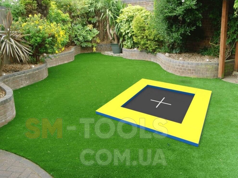 У батутів немає зовнішньої сітки, конструкція стійка і все, що вам потрібно зробити, це розмістити батут у викопаній в ґрунті ямі і вирівняти його.