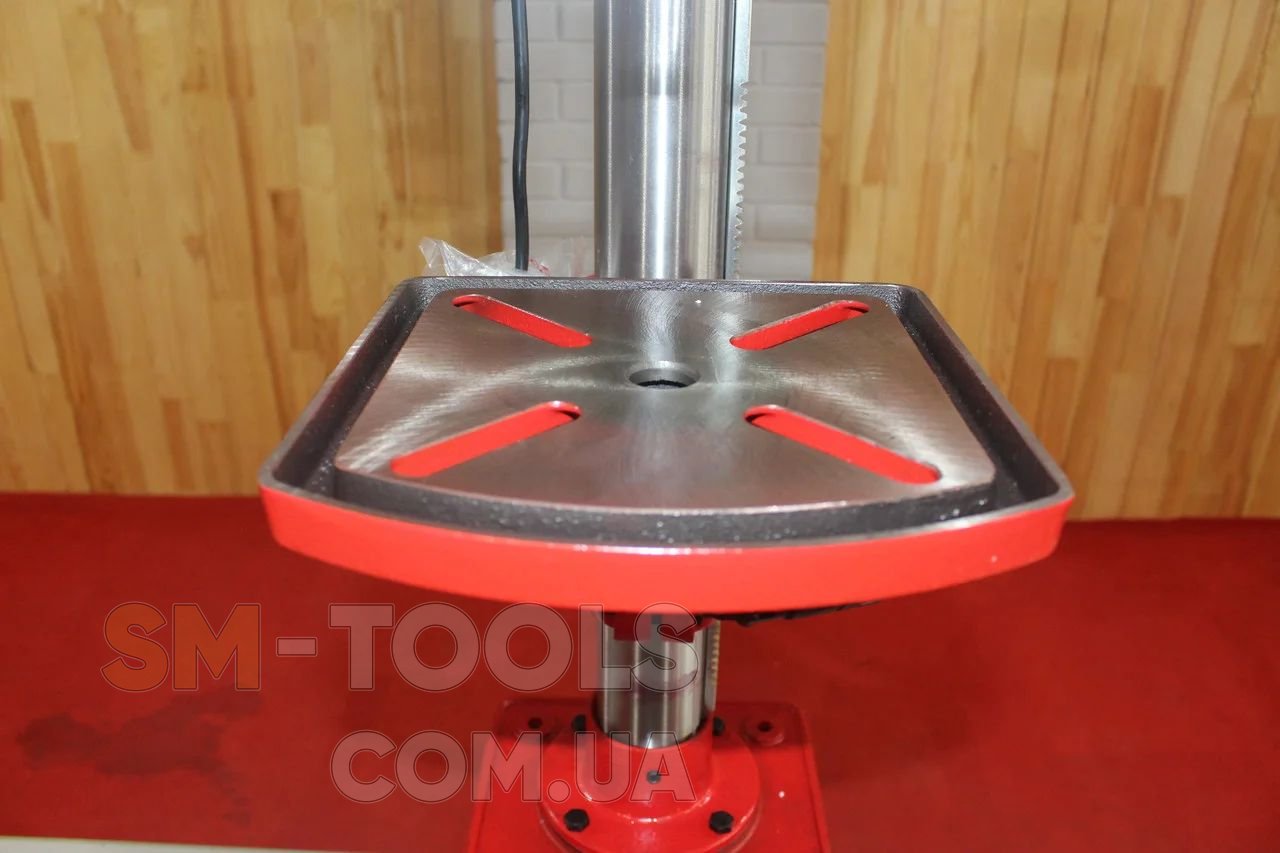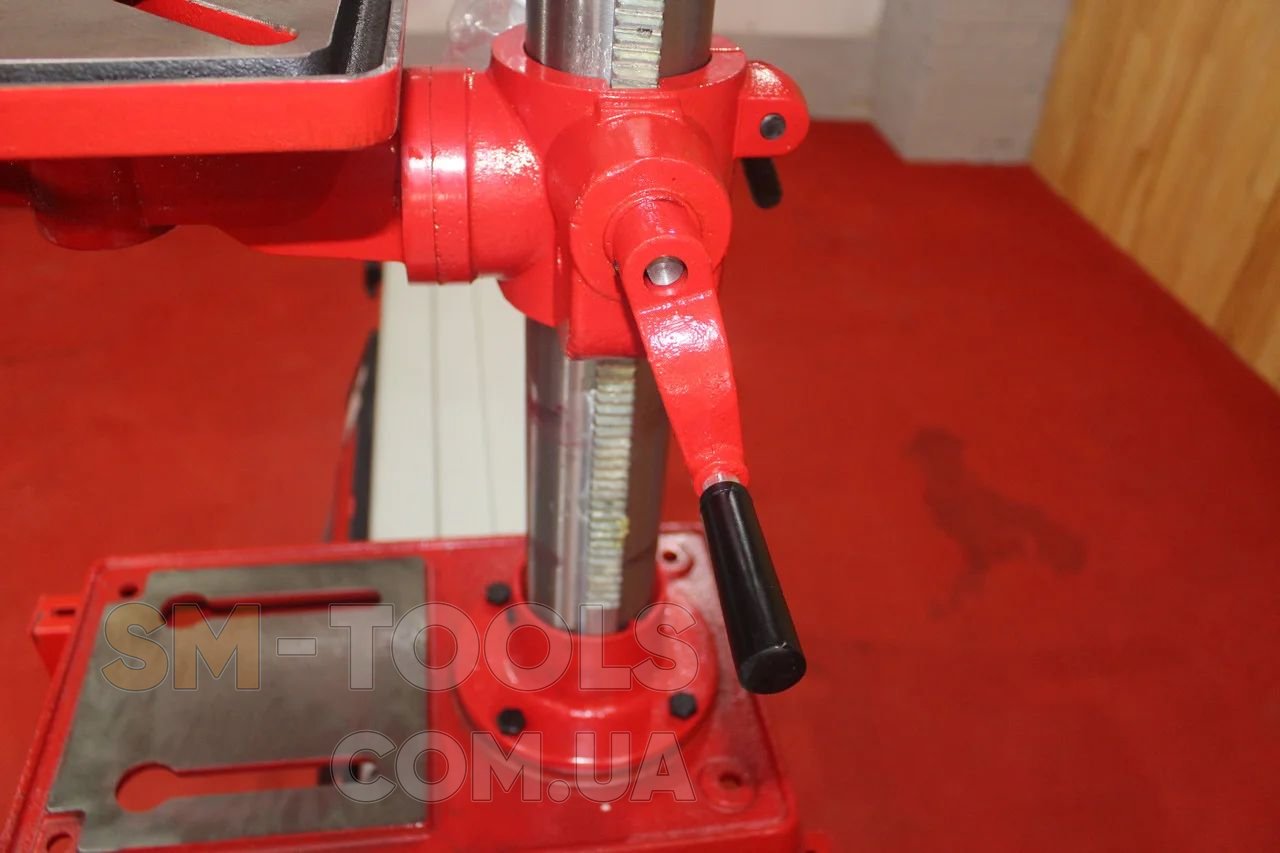 Конструкция относительно проста, но выполнена добротно и содержит все необходимое для точной и уверенной работы. Двигатель рассчитан на режим S1, что означает отсутствие существенного нагревания при номинальной мощности даже в течение длительных погрузочных циклов. Редуктор имеет два ступенчатых пяти-струйных шкива для переустановки ремня, что позволяет выбрать оптимальную скорость и обеспечить необходимый крутящий момент. Пиноль шпинделя оборудован резьбовым упором-ограничителем, это простой в настройке и точный механизм, позволяющий производить установки с помощью штангенциркуля или просто отсчитывая обороты гайки. Заготовку размещают на регулируемом чугунном столе. Он поворачивается вокруг горизонтальной оси, перемещается вверх и вниз по колонне, а если потребуется разместить большую заготовку, может быть отведен в сторону разворотом на колонне. В таком случае опорой выступает верхняя поверхность подставки станка, отфрезерованная в плоскость, перпендикулярная оси сверления.