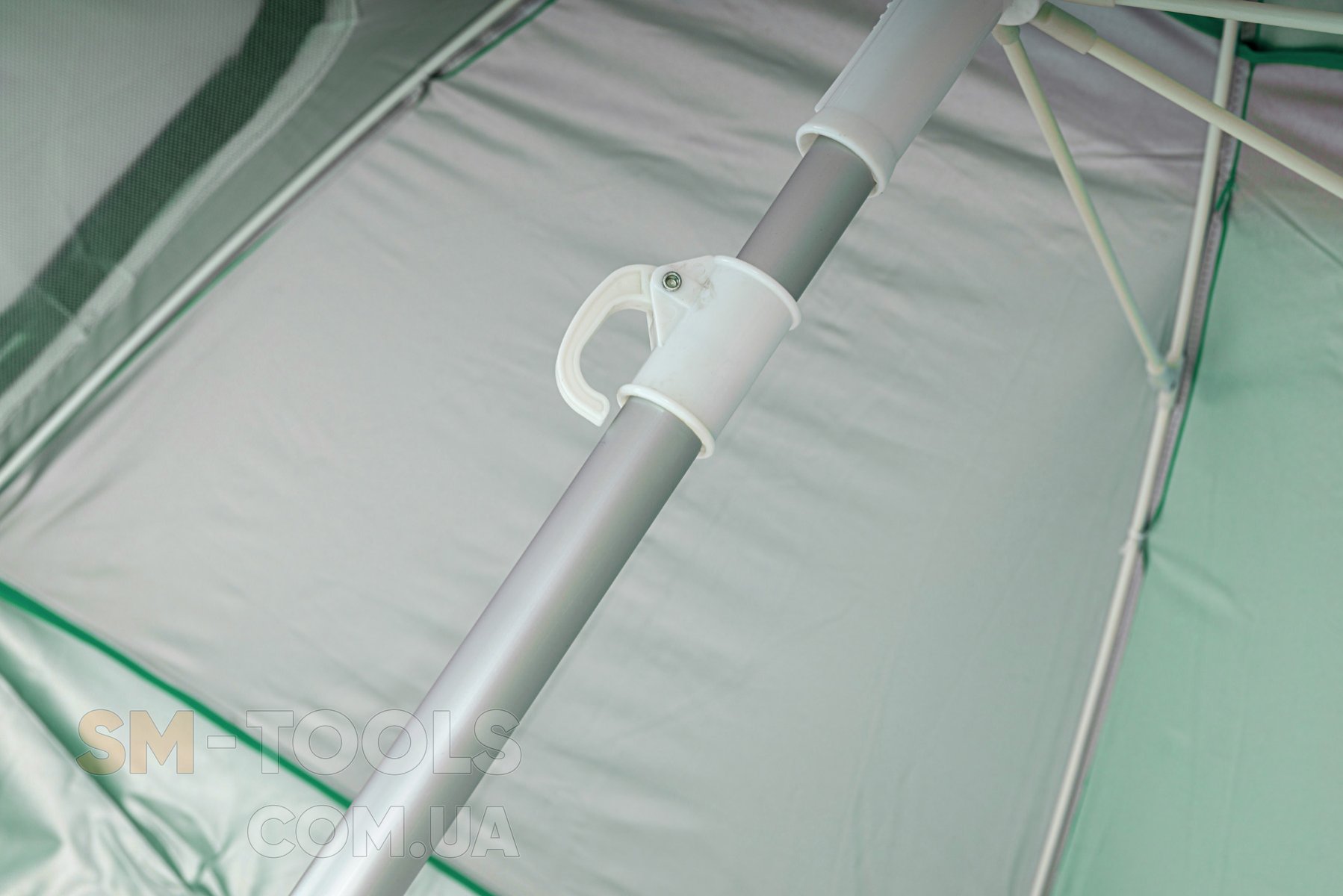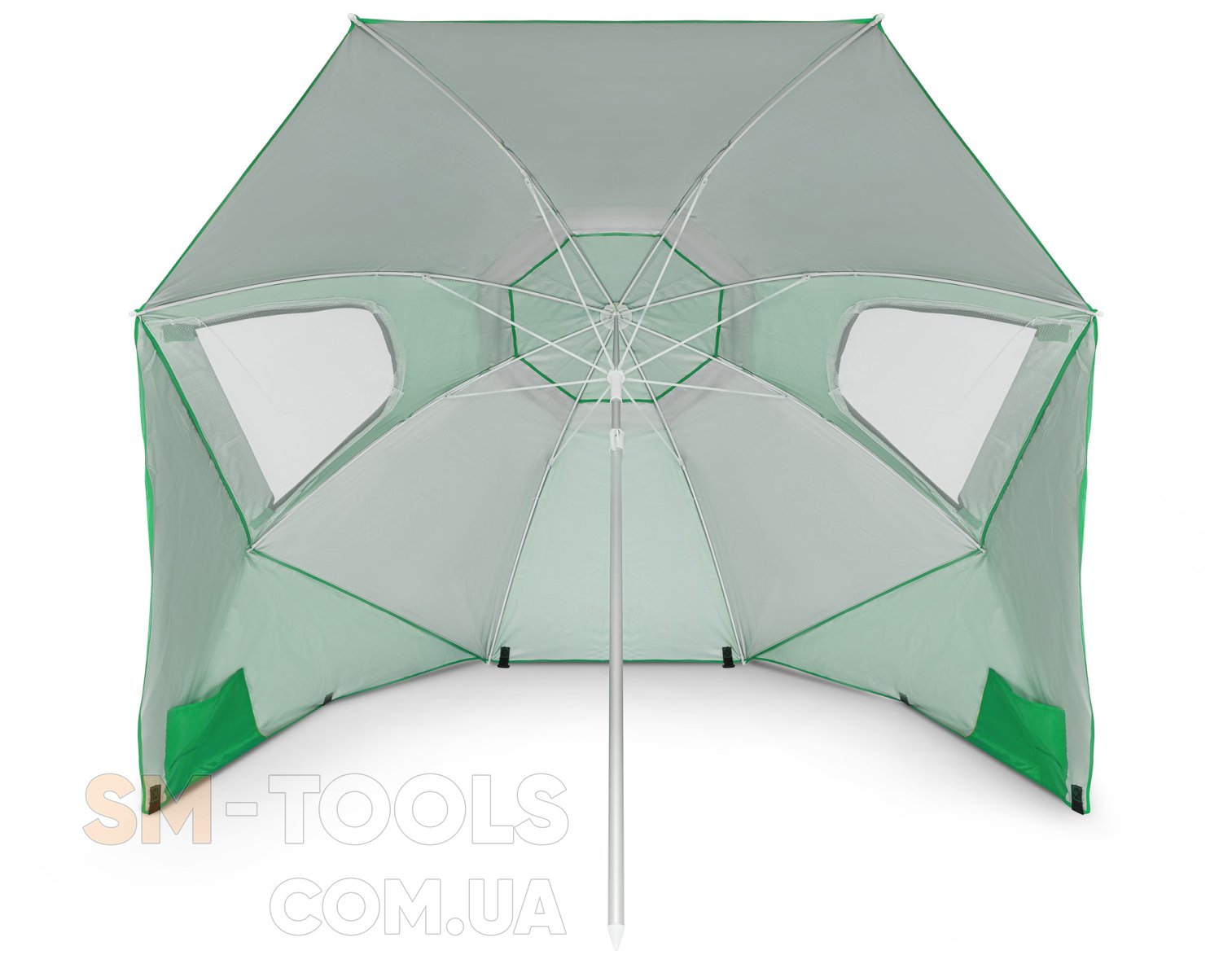 В основу вбудовані особливі бічні чохли, які забезпечують швидку трансформацію з парасольки в намет і навпаки. А кишені, розташовані на чохлах, вдало підходять для зберігання особистих речей.