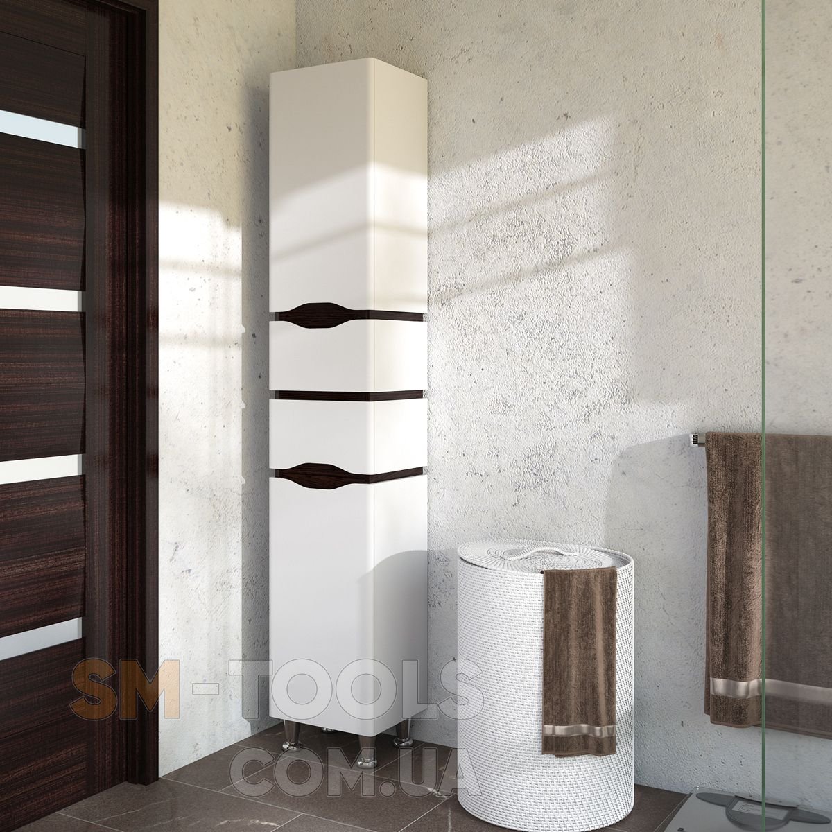 Напольный пенал изготовлен из высококачественного МДФ и окрашен краской итальянского производства Sayerlack. Данный элемент мебели очень вместителен. Если есть место для его установки, рекомендуем его приобрести. Если нет достаточного места, тогда мы предлагаем приобрести полупенал и разместить его над стиральной машиной или в другом месте.