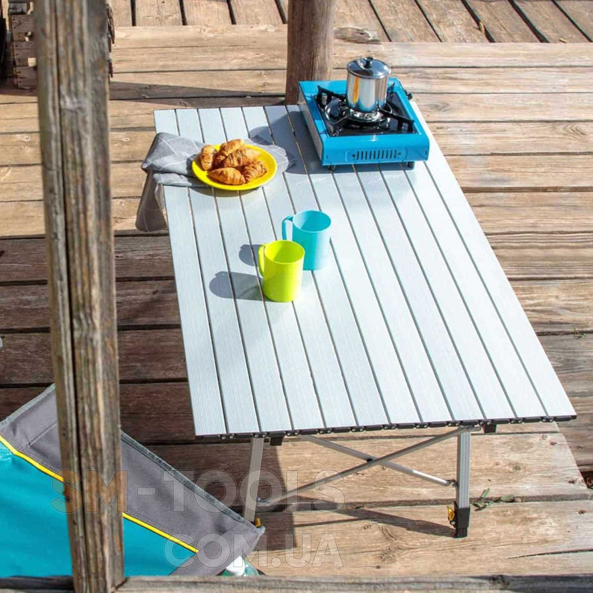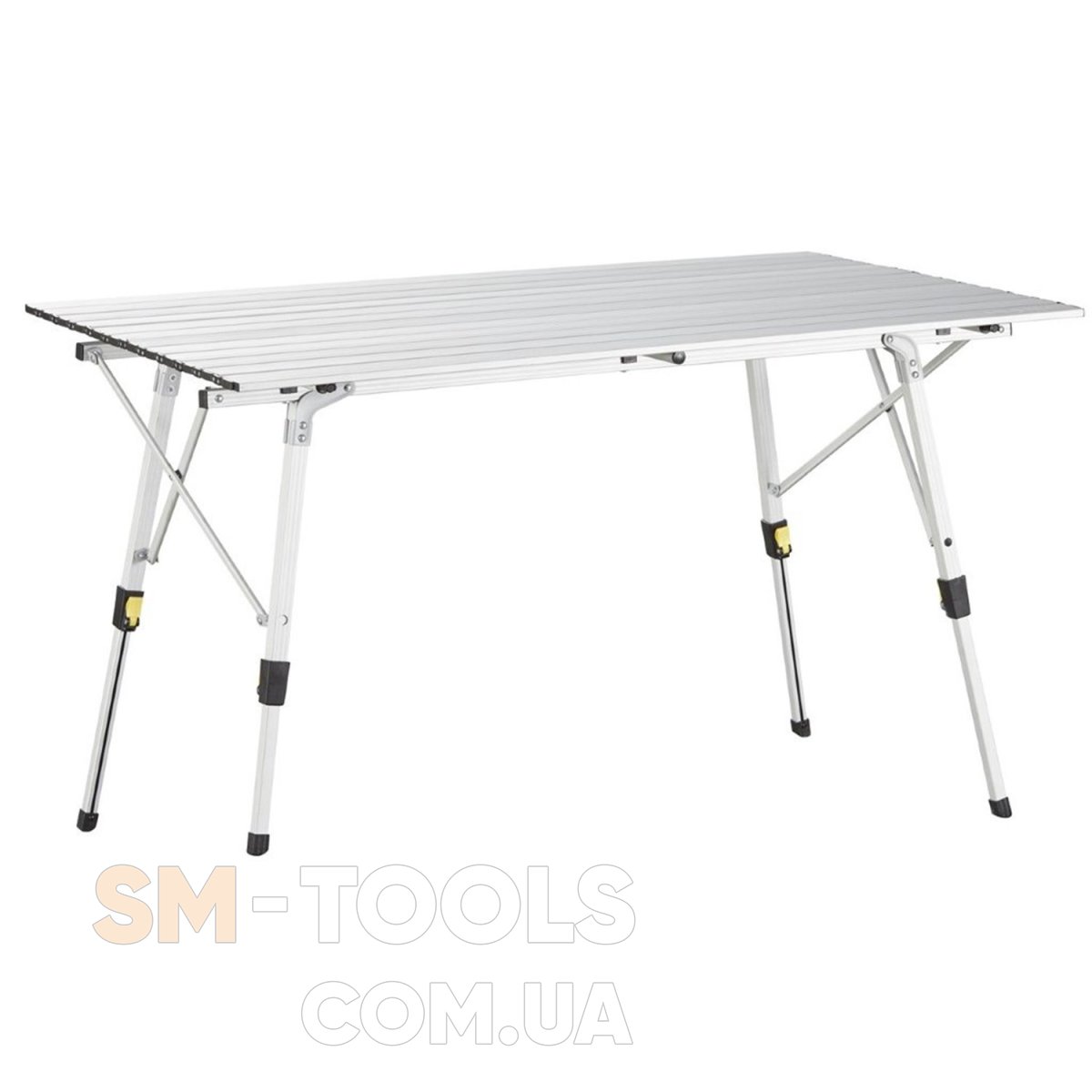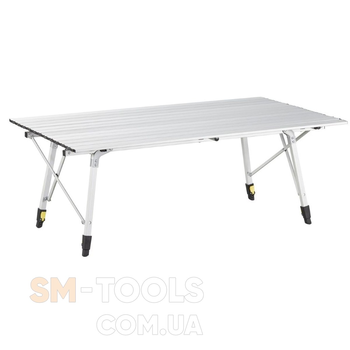 Стільниця має достатні розміри, щоб за столом комфортно розмістилися 6 людей. У складеному вигляді стіл компактно розміщується в чохлі. Алюмінієва поверхня стільниці легко чиститься, і є максимально гігієнічною, оскільки алюміній не формує середовище для розмноження мікробів.