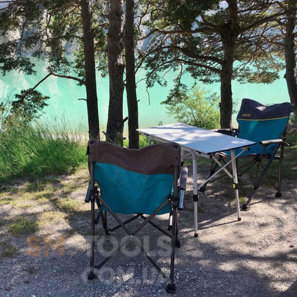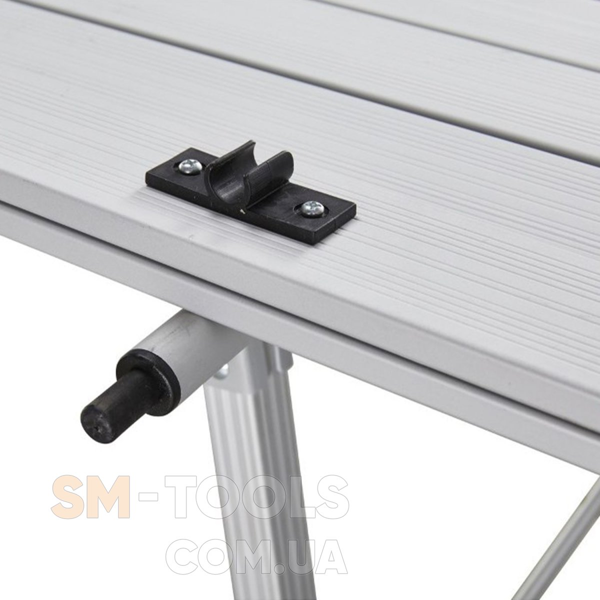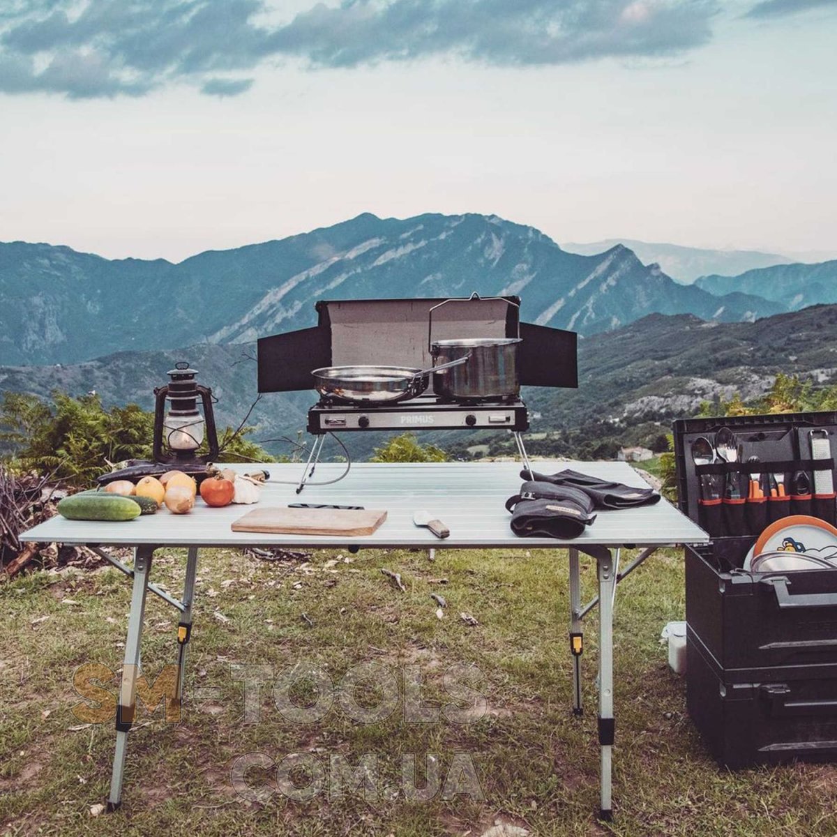 Стільниця має достатні розміри, щоб за столом комфортно розмістилися 6 людей. У складеному вигляді стіл компактно розміщується в чохлі. Алюмінієва поверхня стільниці легко чиститься, і є максимально гігієнічною, оскільки алюміній не формує середовище для розмноження мікробів.