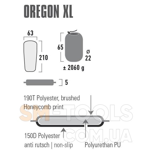 High Peak Oregon XL - самонадувающийся туристический коврик толщиной 5 см, с наполнителем из полиуретановой пены высокой плотности, обеспечивающей превосходную изоляцию и комфорт во время сна. Верх с перфорацией Wave Cut идеально прилегает к телу и способствует легкому складыванию. Форма трапеции отличается простотой использования и экономией веса. Верх коврика изготовлен из высококачественной, нескользящей и приятной для кожи матовой ткани из полиэстера 190T со стильным принтом в виде сот, а низ - из прочного нескользящего полиэстера 150D. High Peak Oregon XL оснащен высококачественным клапаном, который мгновенно всасывает воздух, заполняя пену для быстрого использования. При складывании воздух выходит быстрее, что значительно облегчает свертывание. Коврик поставляется с двумя компрессионными ремнями и чехлом для хранения.