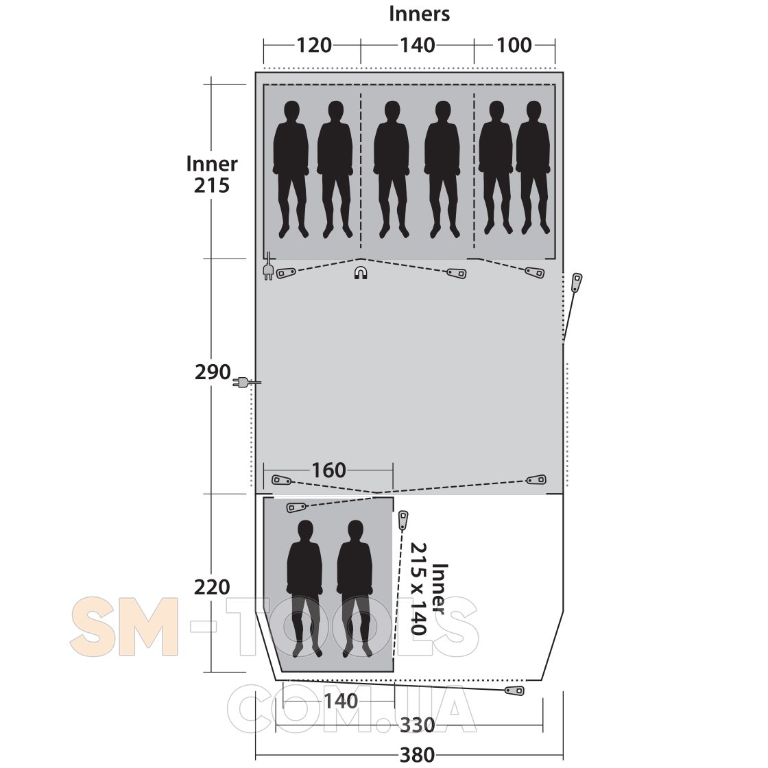 - Sleep Comfort 7 People - стандартный размер спального места составляет 60 см на человека. При использовании надувных матрасов для комфортного сна в палатке могут разместиться 7 человек.