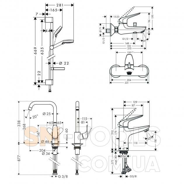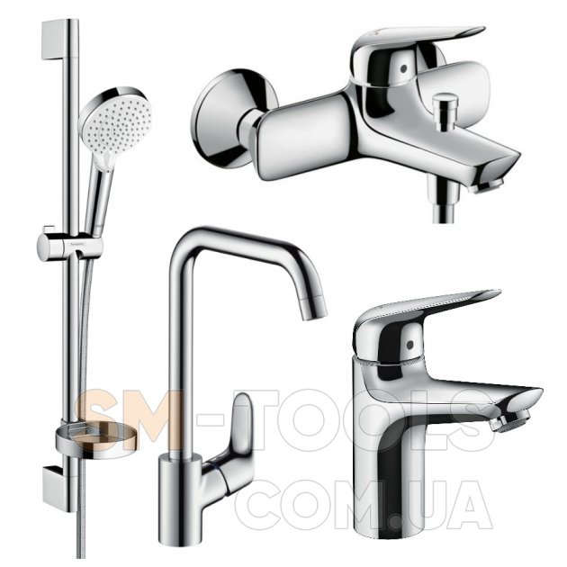 Представленный здесь набор Novus 1152019 от Hansgrohe состоит из следующих моделей: смесителя для раковины Novus 71030000, смесителя для ванны Novus 71040000, душевого гарнитура Crometta Vario 26553400 и кухонного смесителя Focus 318.