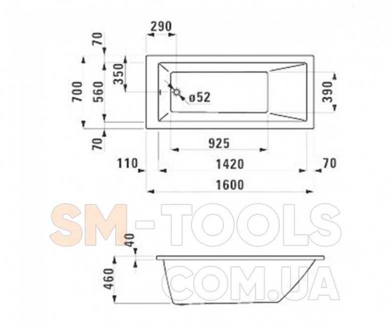 Ванна акриловая, прямоугольная, 1600*700*460 мм, встроенная, без рамы, без панели, с алюминиевым профилем для ножек, белая