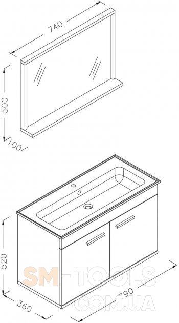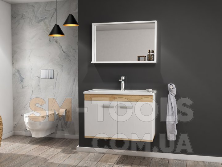 До комплекту входять підвісна тумба з 2 двостулковими дверцятами, керамічна прямокутна мийка завширшки 81.3 см, і настінне дзеркало з полицею розміром 74 х 50 см. Раковина обладнується отвором для встановлення змішувача* і переливним отвором.