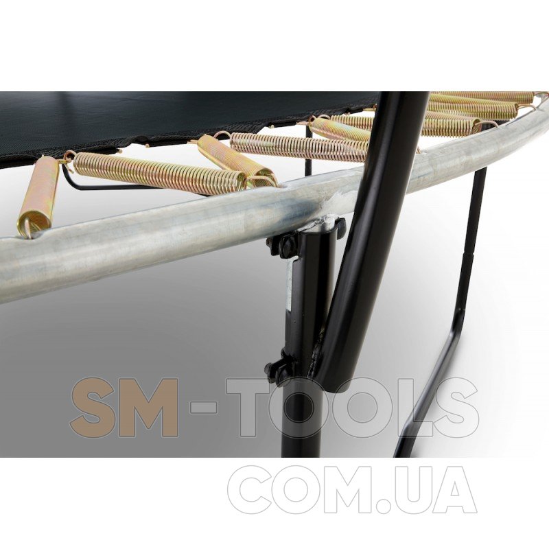 Заявленный набор параметров составил: ширина защитной кромки 36-45 см, предельно допустимая нагрузка 120 кг, диаметр конструкции 430 см, высота рамы 90 см. Данный вариант батутной установки комплектуется 128 пружинами Goldspring twin spring, оснащенными специализированным защитным покрытием и предлагающими длину 18 см.