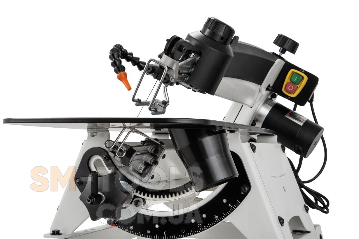 Станок оборудован параллелограммным механизмом привода качающейся части, имеющим ряд особенностей. Во-первых, верхняя часть рамы поднимается, что удобно при наладке или установке заготовки. В верхнем положении она фиксируется и не требует удерживания. Нижнее положение можно корректировать вращением рукоятки, подстраивая под длину пилки и толщину детали. Во-вторых, предусмотрен режим работы с продольной подкачкой полотна (так называемый маятниковый ход), который обеспечивает более «агрессивное» и производительное пиление. В зависимости от требований к скорости, точности и чистоте распила настраивают амплитуду продольных движений в диапазоне от нуля и до максимальной величины. Процедура выполняется поворотом моторного модуля вокруг оси.