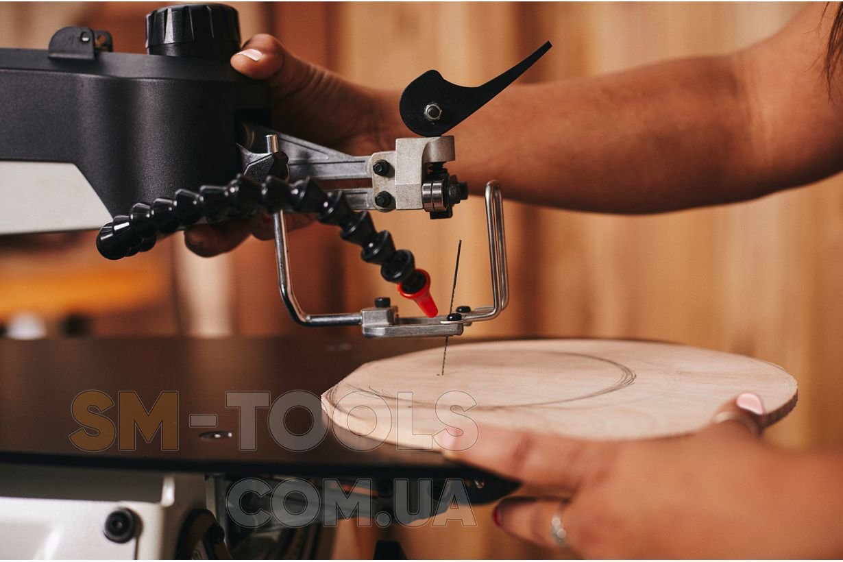 Станок работает с пильными полотнами без штифта. Верхняя часть пилки зажимается эксцентриковым механизмом, совмещенным с натяжителем, нижняя предварительно зажимается в адаптер, а после вставляется в вилку-оправку. В комплекте два таких адаптера, что позволяет иметь в быстром доступе полотна разных типов. Благодаря наличию прорези в рабочем столе существенно упрощается установка на стол заготовок с продетой пилкой.