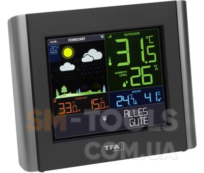 Яркость цветного высококонтрастного дисплея регулируется по трем уровням, а в ночное время оно автоматически затемняется. Метеостанция может быть встроена в местный Wi-Fi с помощью бесплатного приложения TFA VIEW. Просто следуйте инструкциям в приложении.