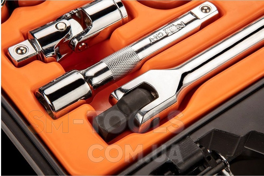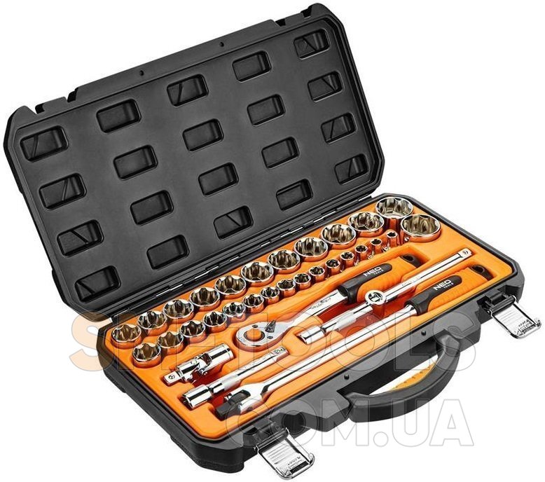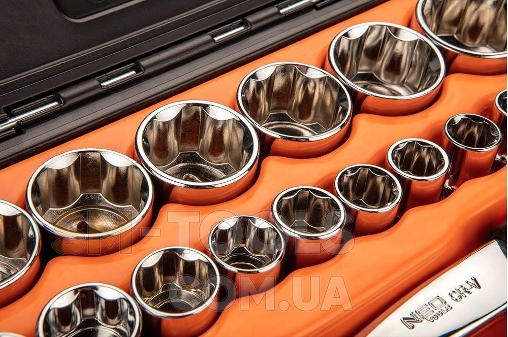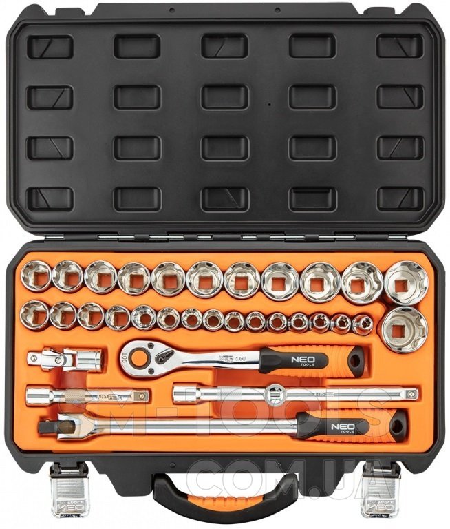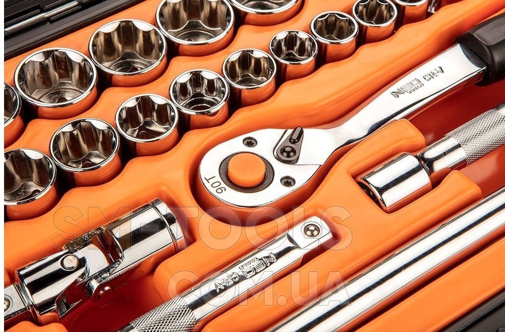 Набор торцевых головок с трещеткой 1/2" NEO, состоит из 33 предметов, изготовленных из высококачественной хромованадиевой стали. В набор входит трещотка с крепким храповым механизмом (90 зубцов). В наборе широкий ассортимент сменных головок от 8 до 36 мм. Дополнительно в наборе есть удобная рукоятка с шарниром, удлинители, универсальный шарнир и переходник 1/2" Mx3/8" F. Набор упакован в удобный чемоданчик. Качество инструмента подтверждено сертификатом TÜV. Бренд NEO оправдывает ожидания профессионалов.