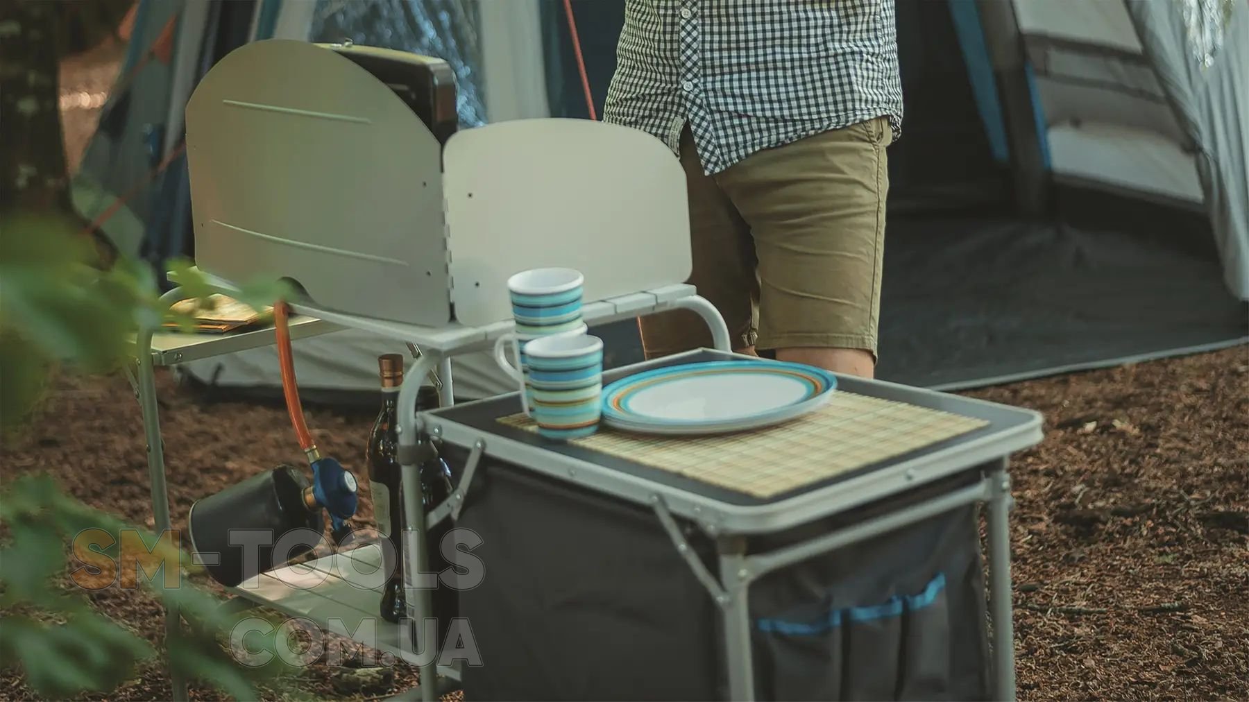 Отдых в палаточном городке не обходится без приготовления пищи. Кемпинговая кухня Easy Camp Sarin Blue (540014) позволит ускорить и оптимизировать этот процесс, сделав его более удобным и организованным. Конструкция имеет устойчивую стальную раму, боковые столики для готовки, встроенную ветрозащиту и шкаф с полками для хранения кастрюль, сковородок, посуды и еды в одном месте. Кухня проста в установке и аккуратно упаковывается в чехол для переноски и компактного хранения.