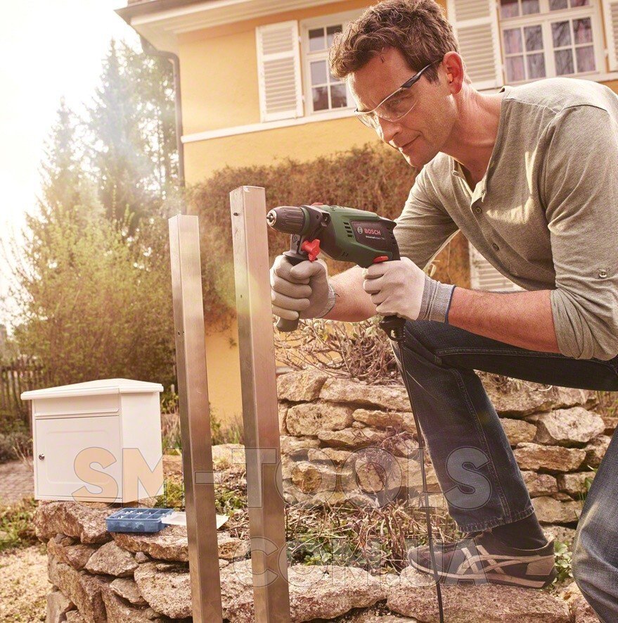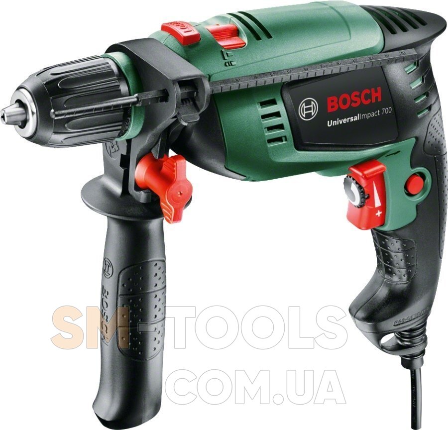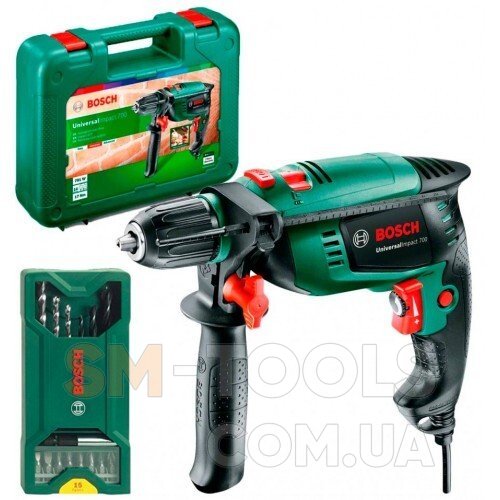 Дрель Bosch UniversalImpact 700 выполняет сверление с ударом отверстий в кирпиче и бетоне диаметром 14 мм, в безударном режиме – в древесине до 30 мм, стали до 12 мм. Быстрозажимной патрон 2-13 мм. Регулировка числа оборотов 50-3000 об/мин. 45000 уд/мин. Максимальный момент затяжки 17 Нм. Реверс. Поставляется в пластиковом чемодане с ограничителем глубины, дополнительной рукояткой, с набором сверл и бит X-line 15 шт.
