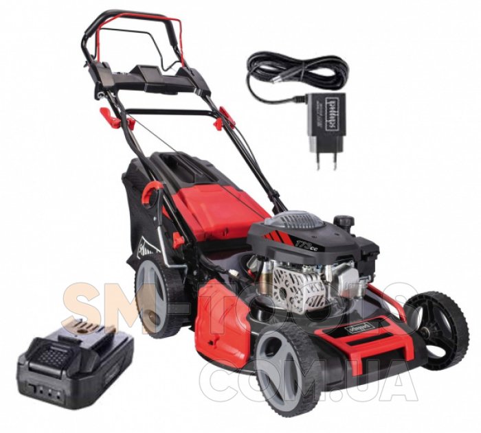 В комплект поставки входит Газонокосилка бензиновая самоходная Scheppach MS173-51E / Аккумулятор / Зарядное устройство / Травозборник / Инструкция