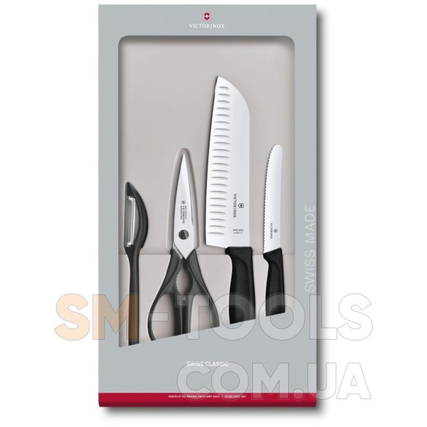 В набор для кухни Викторинокс Swiss Classic Kitchen Set 6.7133.4G входит 4 универсальных инструмента с черными ручками: