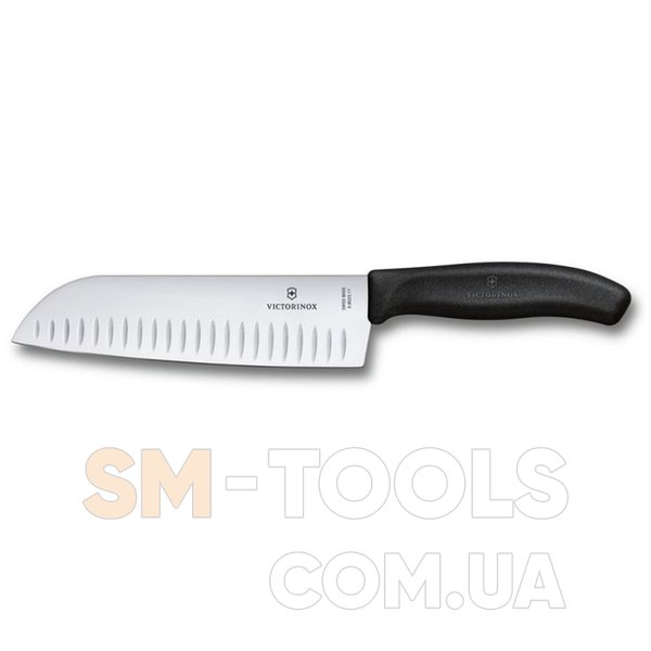 - нож Santoku (сантоку). Широкое лезвие с рифленым краем и длиной 17 см. При нарезке углубления на клинке минимизируют прилипание продуктов к лезвию. Косой кончик лезвия идеален для нарезки кубиками, ломтиками или измельчения продуктов на ровной поверхности. Прекрасно справится с нарезкой мяса, рыбы, овощей или сыра. Рукоять выполнена из термопластичного эластомера (ТЭП). Безопасно мыть в посудомоечной машине. Вес ножа: 140 г.