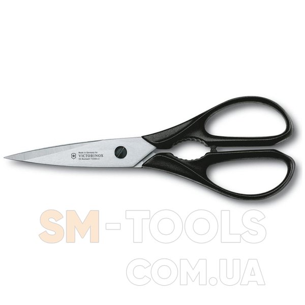 - кухонные ножницы из нержавеющей стали – многоцелевой инвентарь. Лезвия изготовлены из исключительно твердой нержавеющей стали с микрозубчатым режущим краем, чтобы эффективно удерживать разрезаемый предмет/продукт на месте. Конструкция ручек имеет специально отверстие, предназначенное для раскалывания орехов или для вскрытия плохо откручивающихся крышек на банках. Ручки изготовлены из прочного синтетического пластикового материала. Ножницы не рекомендуется мыть в посудомоечной машине.