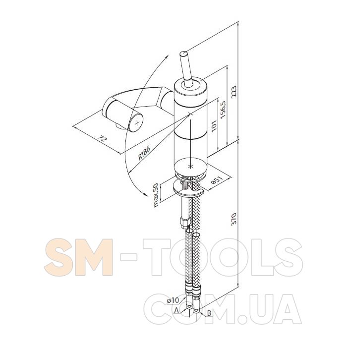 Вращение излива на 360° в горизонтальной и на 180° в вертикальной плоскостях, вращение аэратора на 360°.