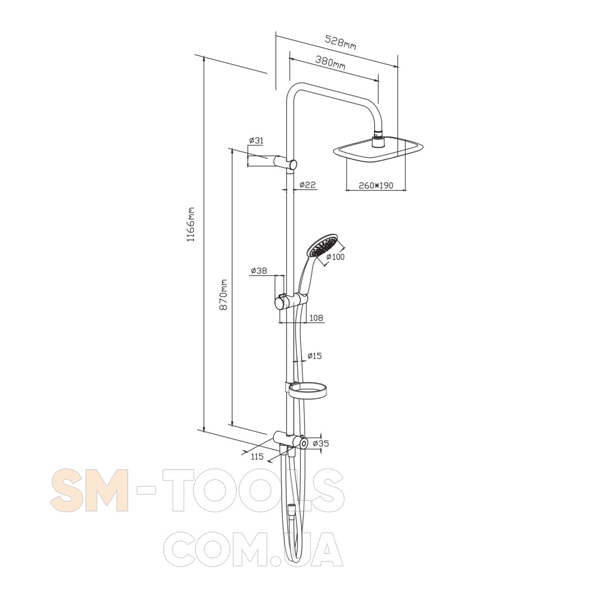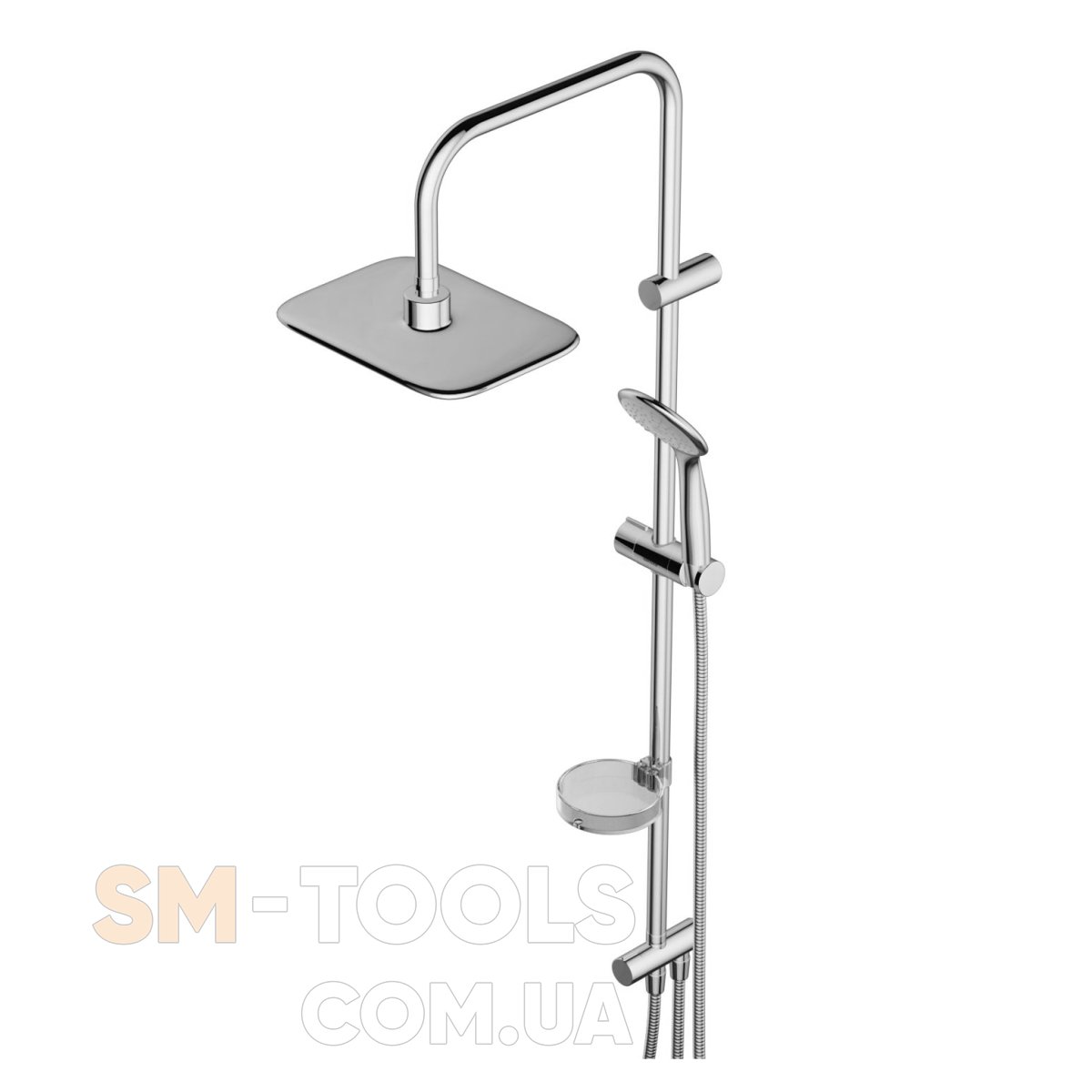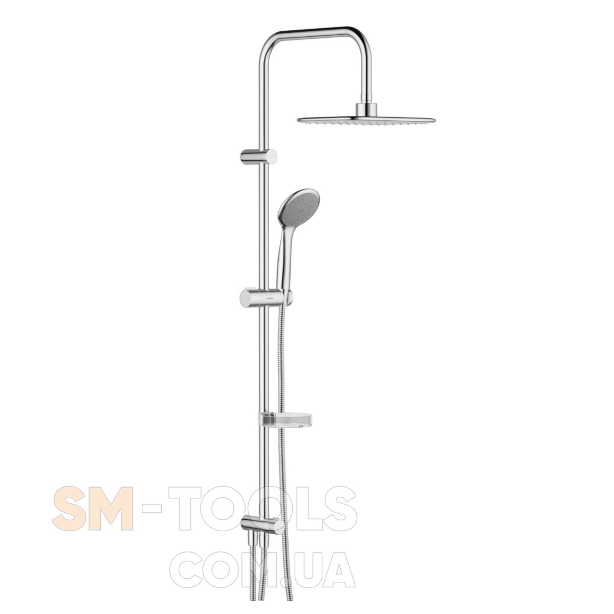 Душевой гарнитур Palace Evo 974200000 от Damixa состоит из прямоугольного однорежимного верхнего душа с размером душевой поверхности 26 x 19 см, интегрированного со штангой кронштейна с выносом на 38 см, круглой однорежимные ручной лейки диаметром 10 см с регулируемым по высоте держателем, душевой штанги общей высотой 116,6 см, душевого шланга в металлической оплетке длиной 175 см, а также мыльницы.