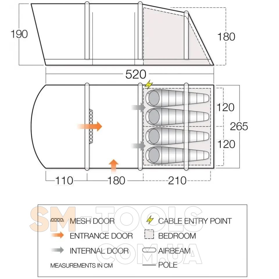 - King Pole Side Door Compatible - встроенные люверсы позволяют использовать специальные телескопические стойки King Poles (не поставляются в комплекте) в виде опор для создания навеса от солнца над входом.