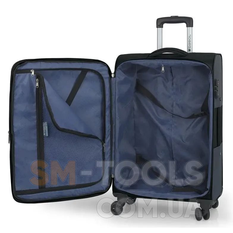Модель Gabol серии Sky оснащена кодовым замком системы TSA. На фасадной части размещен карман на молнии. Внутри имеет ремни для фиксации вещей. Чемодан оснащен четырьмя спаренными роликовыми колесами из высокотемпературного термопластичного полиуретана (TPU). Материал обладает прочностью сравнимой с пластиком, гибкостью силикона, а так же имеет повышенную устойчивость к перепадам температур. Отличительной особенностью колес из TPU материала является снижение шума до минимума при качении чемодана по неровной поверхности. Благодаря устойчивости к истиранию материал колес отличается длительным сроком эксплуатации. Эргономичная система выдвижной телескопической ручки с кнопочным фиксатором позволяет отрегулировать высоту выдвижной ручки для дополнительного удобства и комфорта пользователя. Чемодан легкий, маневренный и удобный для транспортировки.