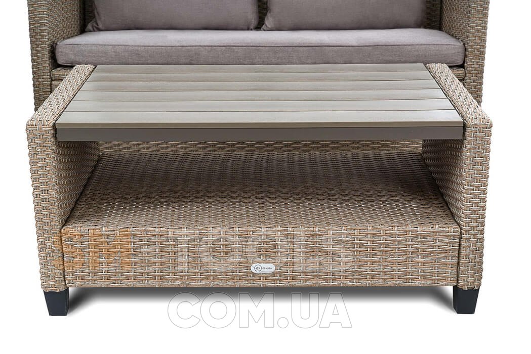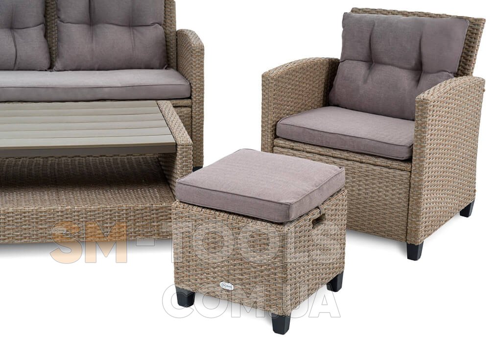 Основна конструкція продукту виготовлена з міцного техноротанга, який неймовірно стійкий до раннього старіння, дуже зручний у догляді, чудово протистоїть пекучому сонцю, сильній вологості, різкій зміні температур та будь-яким іншим зовнішнім факторам.