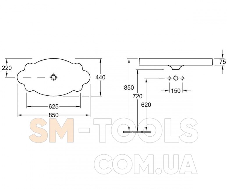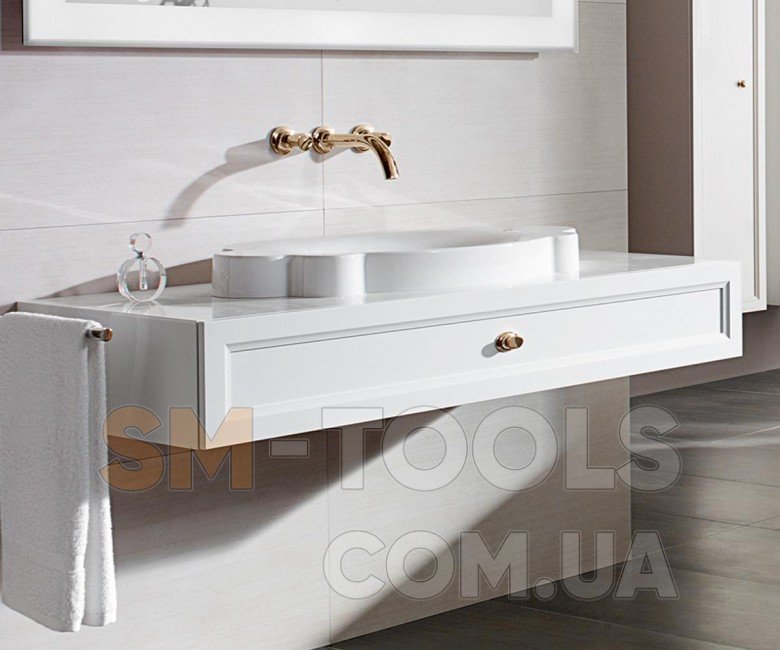 Умывальник без наличия отверстий под смеситель, без перелива, включает незапираемый сливной клапан с керамической крышкой, включает вырезной шаблон.