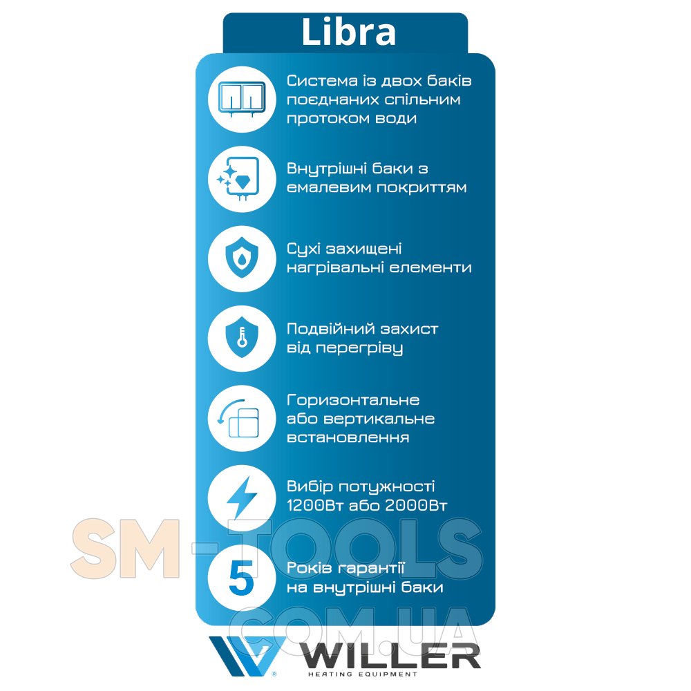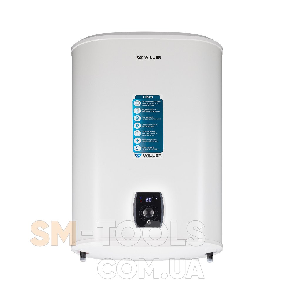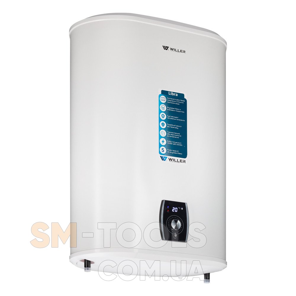 Водонагрівачі Willer EVH30DRI Libra обладнані електронною панеллю керування з вбудованим дисплеєм. Під час експлуатації дисплей відображає температуру води в бойлері. Під час налаштування за допомогою ручки терморегулятора на дисплеї відображається обрана температура нагріву води. Панель управління дозволяє вмикати наступні режими потужності: 1200 Вт (працює один ТЕН) та 2000 Вт (працюють обидва ТЕНи).