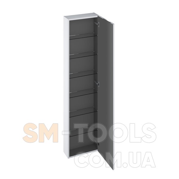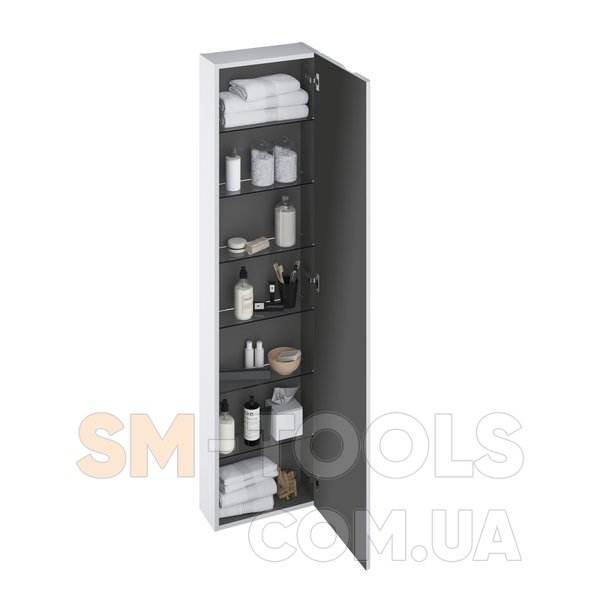 Высокий пенал SB Balance 400 с 6 полками из дымчатого стекла выпускается в исполнении белый/белый или белый/графит. Поставляется в сборе, включая монтажный комплект (винты, петли, заглушки). Пенал крепится к стене.