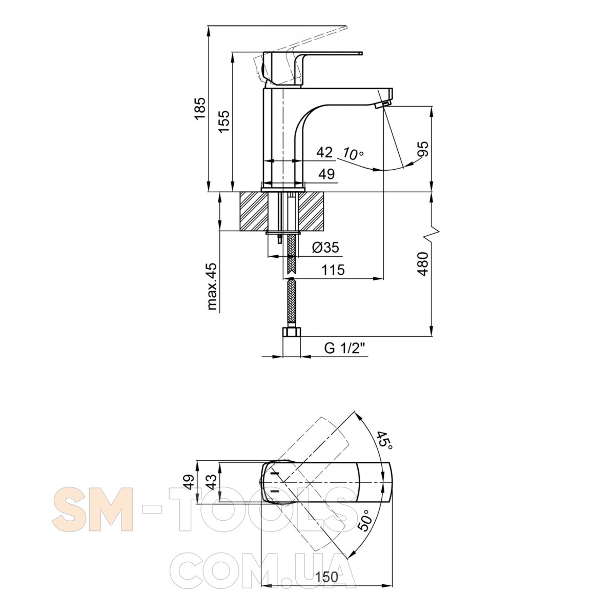 Высота излива, мм 95
