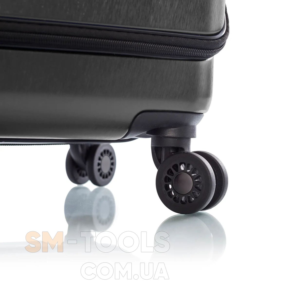 Чемодан оснащен четырьмя полноповоротными колесами системы Spinner с возможностью независимого разворота каждого колеса на 360°. Системой предусмотрено равномерное перераспределение нагрузки на каждое колесо, что в свою очередь способствует плавному качению и маневренности чемодана, прилагая при этом минимум усилий.