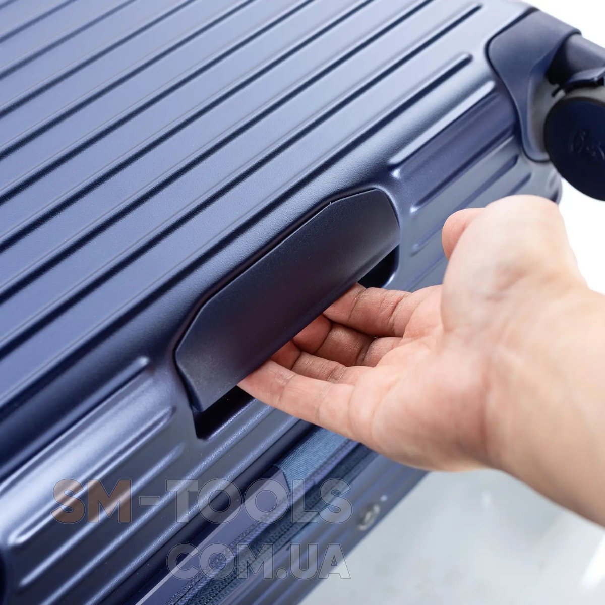 - Текстурированная поверхность корпуса чемодана.