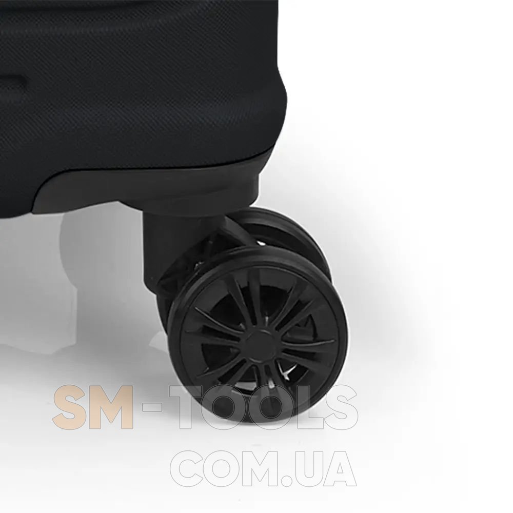 Чемодан оснащен четырьмя полноповоротными, спаренными колесами с возможностью независимого разворота каждого колеса на 360 °. Системой предусмотрено равномерное перераспределения нагрузки на каждое колесо, что в свою очередь способствует плавному качению и маневренности чемодана, прилагая при этом минимум усилий. Колеса изготовлены из высокотемпературного термопластичного полиуретана (TPU). Материал обладает прочностью сравнимой с пластиком, гибкостью силикона, а так же имеет повышенную устойчивость к перепадам температур. Отличительной особенностью колес из TPU материала является снижение шума до минимума при качении чемодана по неровной поверхности. Благодаря устойчивости к истиранию материал колес отличается длительным сроком эксплуатации.