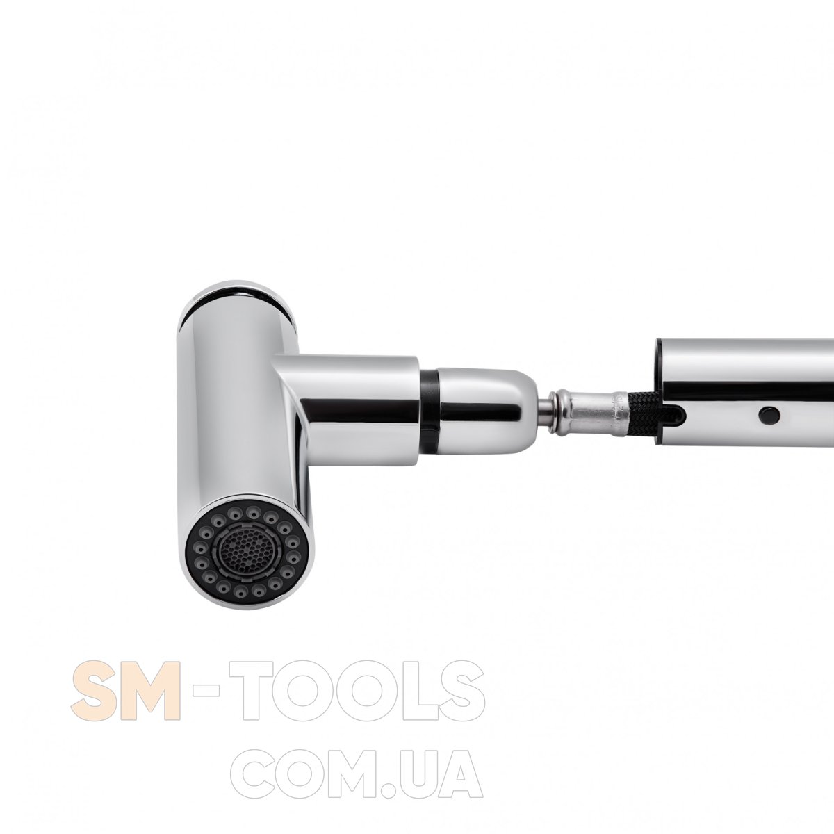 Смеситель для кухни с выдвижным изливом qtap scorpio 9050105fc изготовлен из высококачественной латуни с глянцевым хромированным покрытием, что обеспечивает долговечную бесперебойную работу изделия. благодаря выдвижной форме излива и двум режимам подачи струи, которые переключаются кнопкой на изливе, можно легко очистить труднодоступные места на посуде. длина выдвижного шланга 1470 мм. Управление температурой и напором воды осуществляется с помощью удобного рычага.