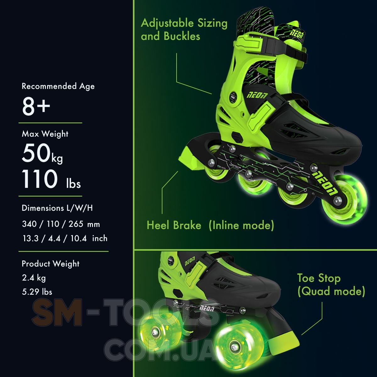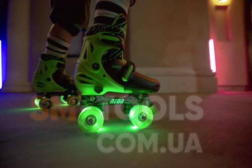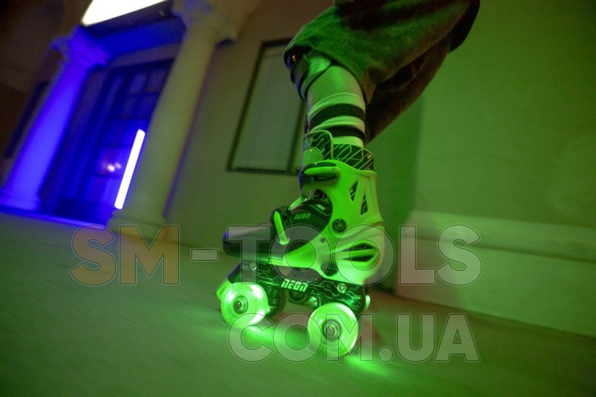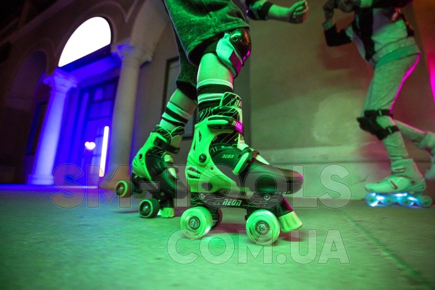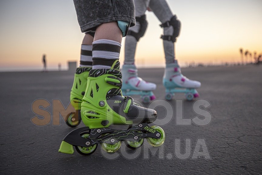 Это набор 2в1 включает в себя сразу 2 типа роликовых коньков Inline (Линейные, 4 колеса в ряд.) + Quad (по 2 колеса расположены поперечно). Именно благодаря вариативности набор Neon Combo Skates будет удобен и полезен для ребенка, которому предстоит только освоить роликовые коньки. Благодаря возможности вариативного выбора типа роликов в данной модели, обучение будет проходить наиболее продуктивно и позволит безопасно освоить ролики, используя преимущества каждого из типов.