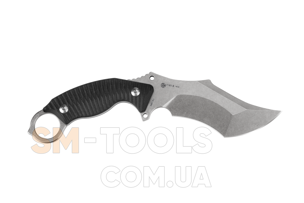 Нож F181 имеет полную длину 22,9 см, а весит 198 грамм. Длина клинка составляет 11,5 сантиметра, длина рукояти – 11,4 сантиметра. Толщина клинка – четыре с половиной миллиметра. Жесткость клинка достигает 58-60 единиц по шкале Роквелла. Текстурированные накладки из G10 фиксируются стальными болтами под торкс. Вместе с ножом добавляются ножны для хранения, изготовленные из АБС-пластика. Ножны предполагают разные варианты крепления.
