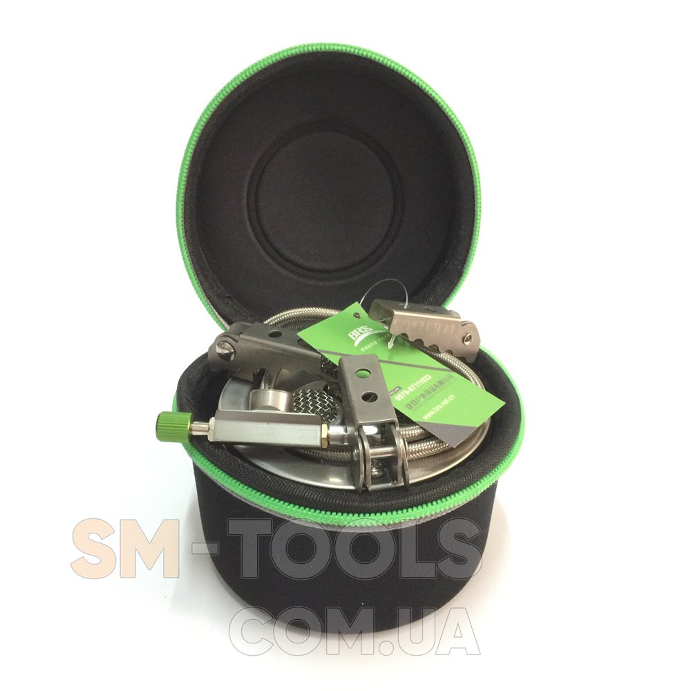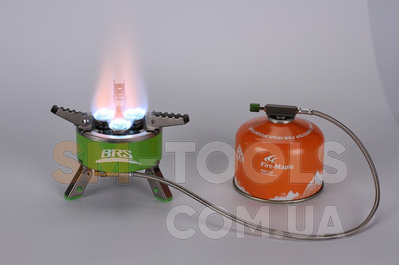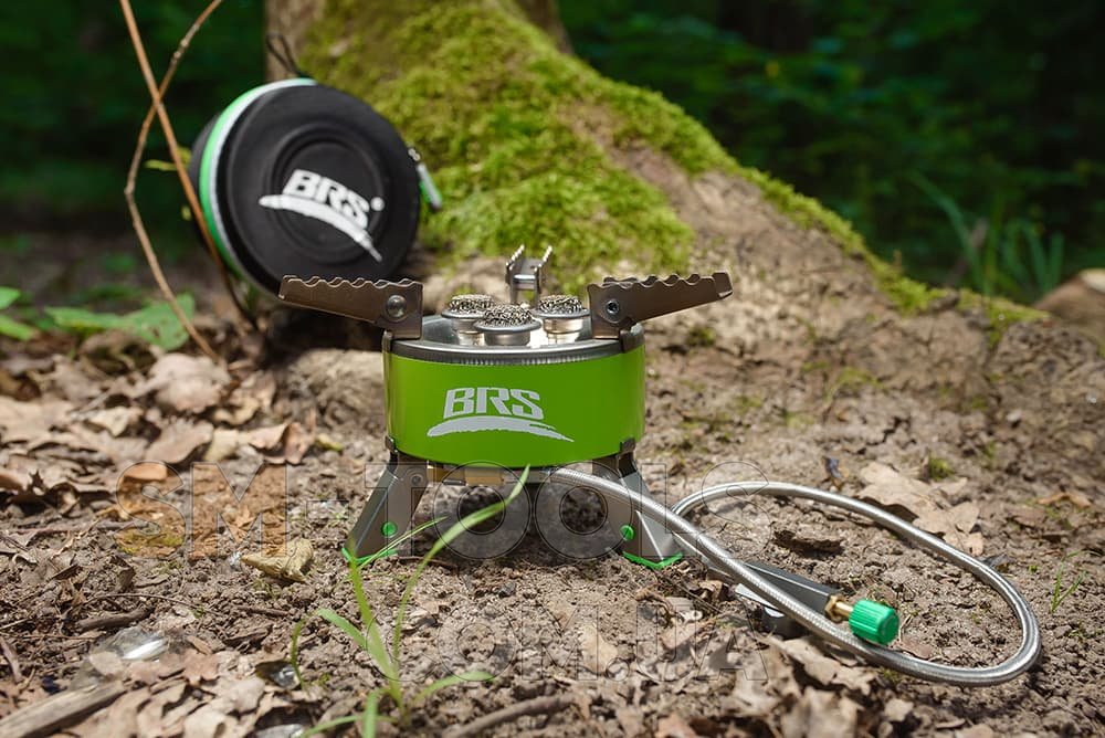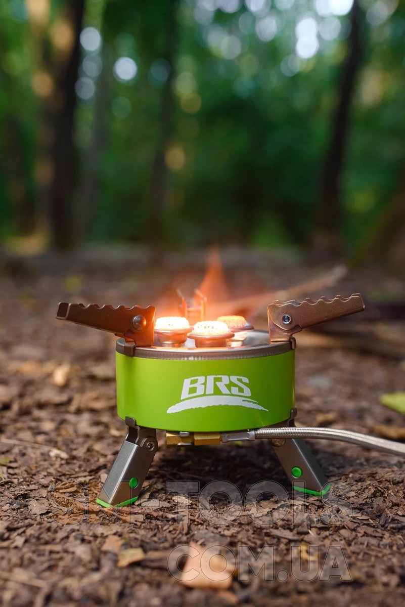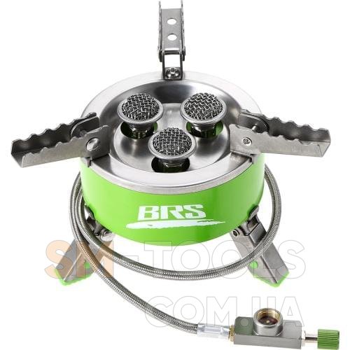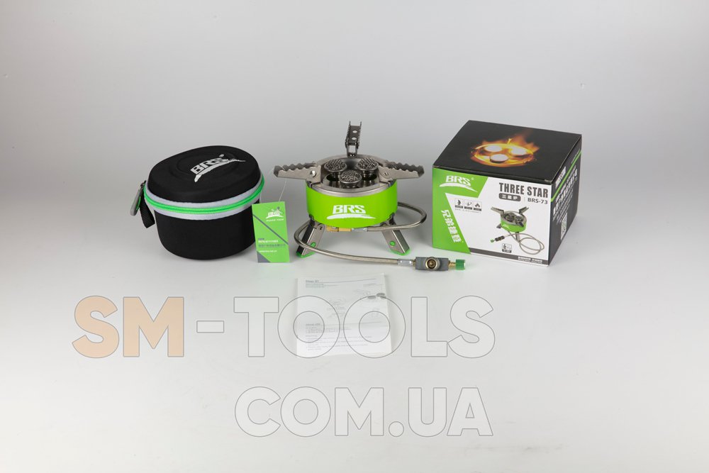 Модель горелки BRS-73 имеет три конфорки, работают синхронно. Это создает массивный поток пламени, позволяющий нагреть 1 литр воды за менее 4 минут. Газа при этом потребляется совсем немного. Это изделие также можно применять в качестве миниатюрного мангала. Для изготовления горелки были использованы такие материалы как алюминий, медь, сталь, защищенная от ржавчины. Поджог здесь внешний, а в качестве топлива используется сжиженный газ. Предусмотрен жесткий чехол в наборе для удобного хранения и переноски.
