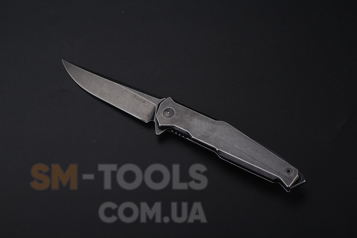 Так, клинок изготовлен из сплава 14C28N – одного из лучших для кухонных ножей и других, которым имеет частый контакт с водой. У него высокая сопротивляемость любым видам коррозии, а вместе с тем — твердость около 58-60 HRC, что обеспечивает хорошую устойчивость заточки. Режущая кромка ножа сделана по всей своей длине гладкой. А высокую прочность клинка обеспечивает и достаточно большая толщина – 3,1 мм. Кроме того, что клинок сделан черным, он еще и матовый, что достигнуто путем шлифовки Stone washed.