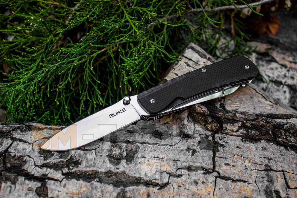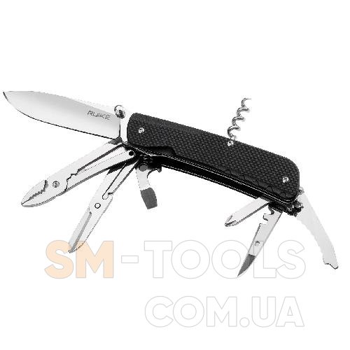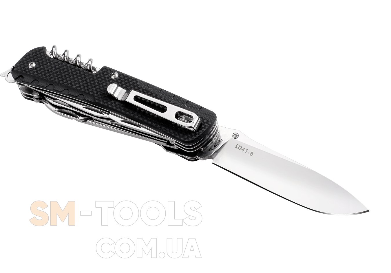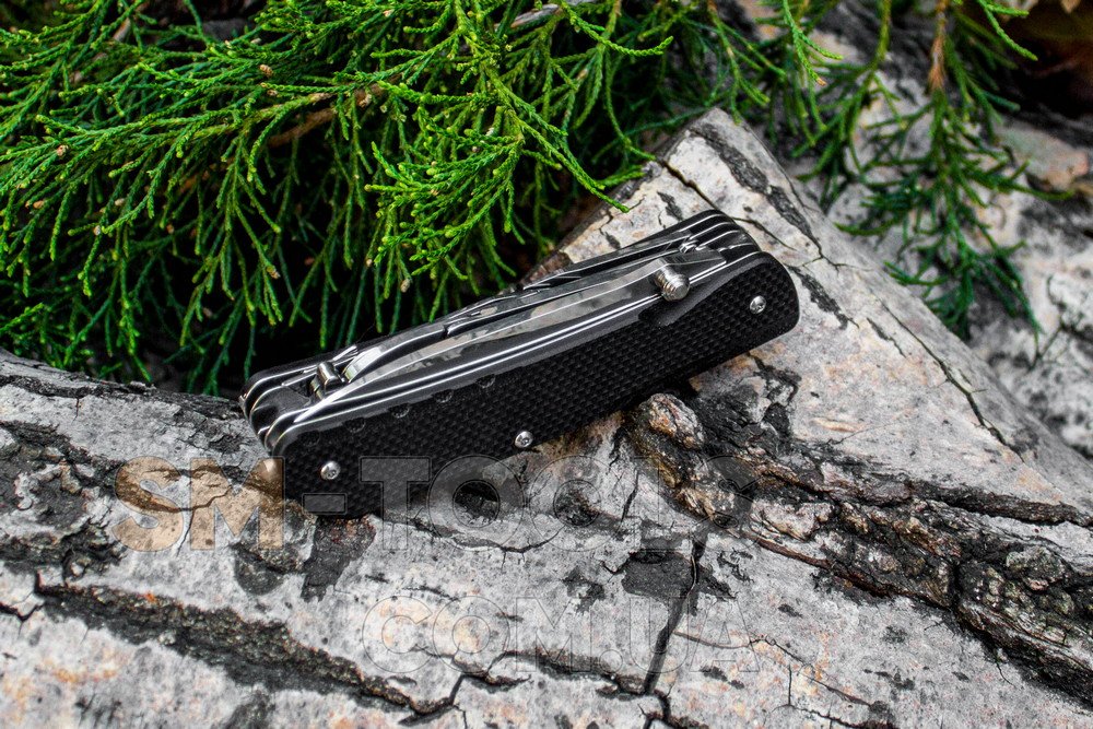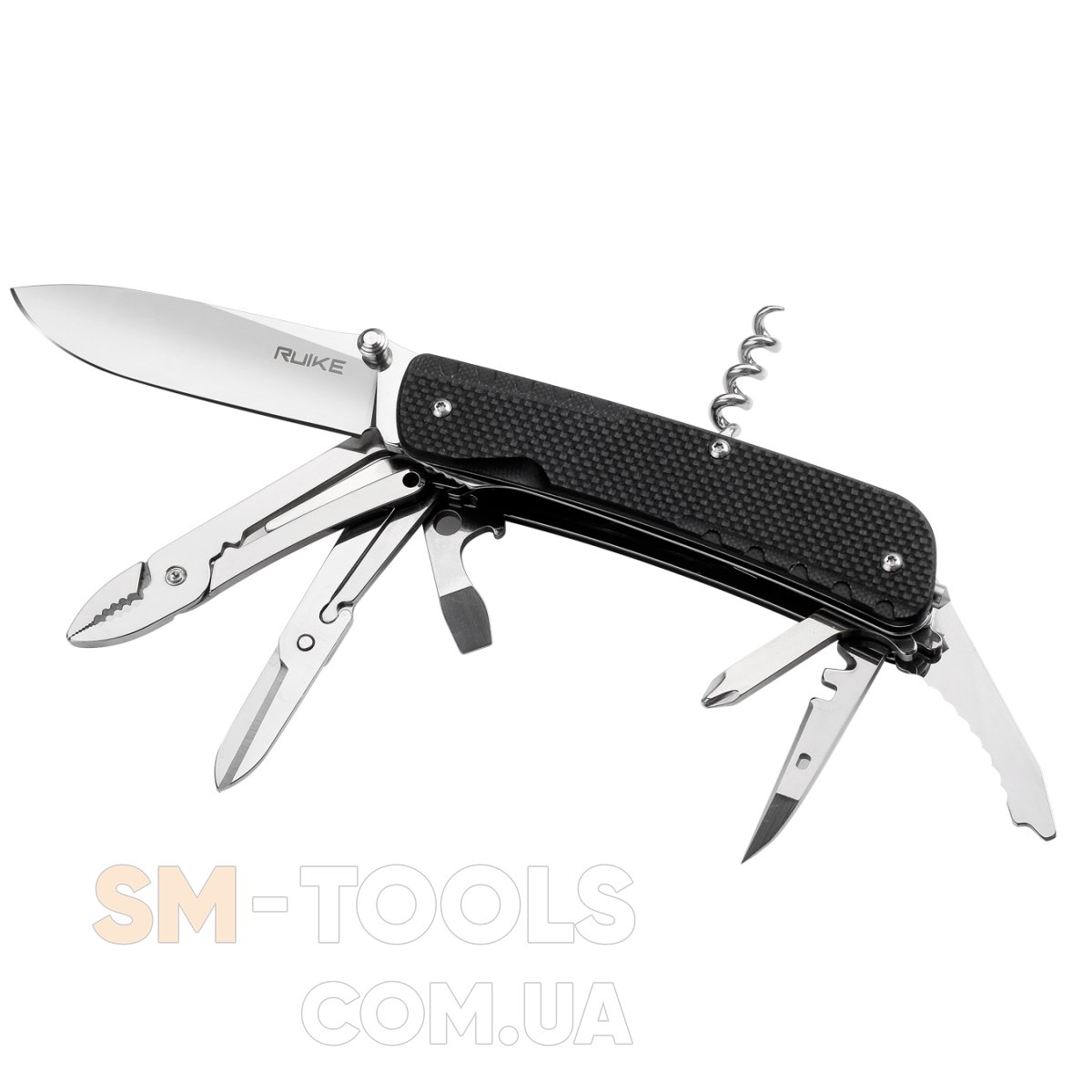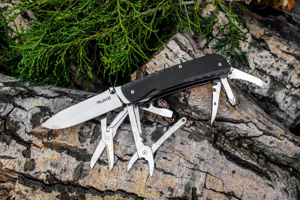 В наборе Ruike LD41 находится аж 21 инструмент, кроме основного широкого клинка. Присутствуют следующие элементы: плоскогубцы, ножницы, 2 вида кусачек, загиб для проволок, несколько прямых отверток и одна крестовая, развертка, шило, штопор, открывалка для бутылок, инструмент для снятия изоляции, гаечный ключ, выдвигаются кольцо для темляка и отсоединяющийся пинец. Подобраны только самые полезные инструменты, которые смогут пригодиться людям с разными увлечениями.