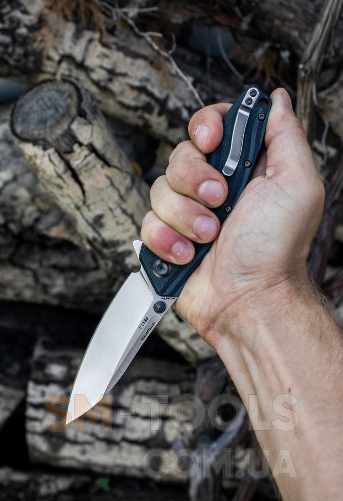 Рукоять ножа має анатомічні форми і завдяки тому, що складається з металевих лайнерів і накладок з G10, володіє відмінною міцністю і стійкістю до несприятливих умов. Фактурний візерунок на поверхні накладок дозволяє впевнено утримувати ніж будь хватом.