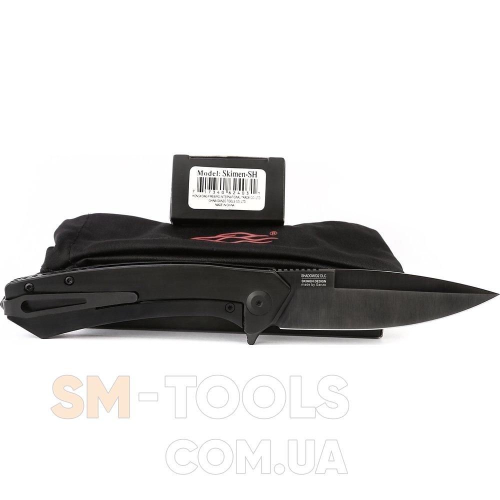 У складі ножа-надзвичайно міцна, стійка до зносу сталь марки D2. Захищений від корозії металевий сплав демонструє високі показники твердості. Значення твердості у ножа-близько 60 одиниць за шкалою Роквелла, що досить добре для даного виду продукції. Тип заточування-прямий. Довжина клинка налічує вісім з половиною сантиметрів, товщина – три з половиною міліметри. Ніж складаний, лезо витягується за допомогою зручного замка Flipper. Skimen-SH надійним чином захищений від випадкового відкриття або закриття. Він безпечний в експлуатації, і має просту конструкцію. Загальна довжина ножа становить 20,5 сантиметра. Такі скромні габарити дають перевагу ножу для застосування кожен день. Його можна запросто помістити в сумку або кишеню, і використовувати в разі потреби, модель завжди під рукою.