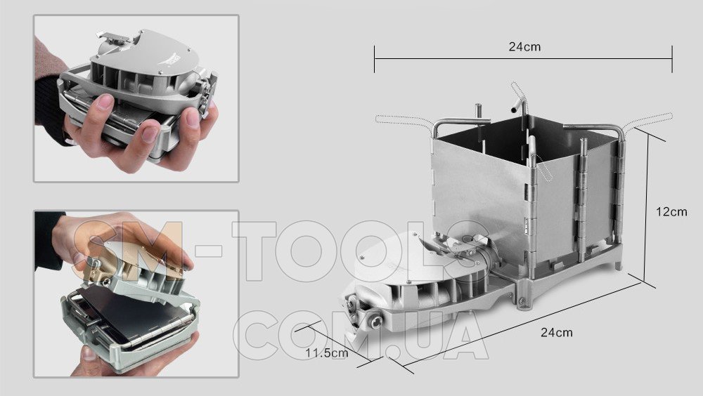 Легкая и маленькая горелка: в длину достигает 24 сантиметра, а высота составляет 12 сантиметров. В сложенном состоянии помещается в ладонь. Прекрасный помощник для кулинарного процесса в полевых условиях. Выполнена модель из надежной стали, устойчивой к коррозии и высоким температурам. Опорные стержни возвращаются в соответствии с размером котелка. Конструкция выдерживает нагрузку до 24 кг.